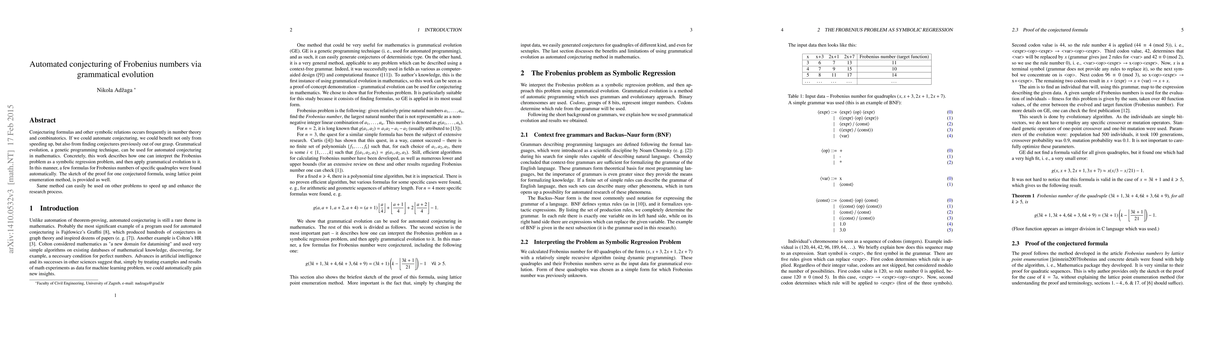 This paper explores the use of grammatical evolution, a genetic programming technique, to automate the conjecturing of Frobenius numbers in number theory. By framing the Frobenius problem as a symbolic regression task, the method successfully generated conjectured formulas for specific quadruples, demonstrating its potential to expedite and enhance mathematical research.