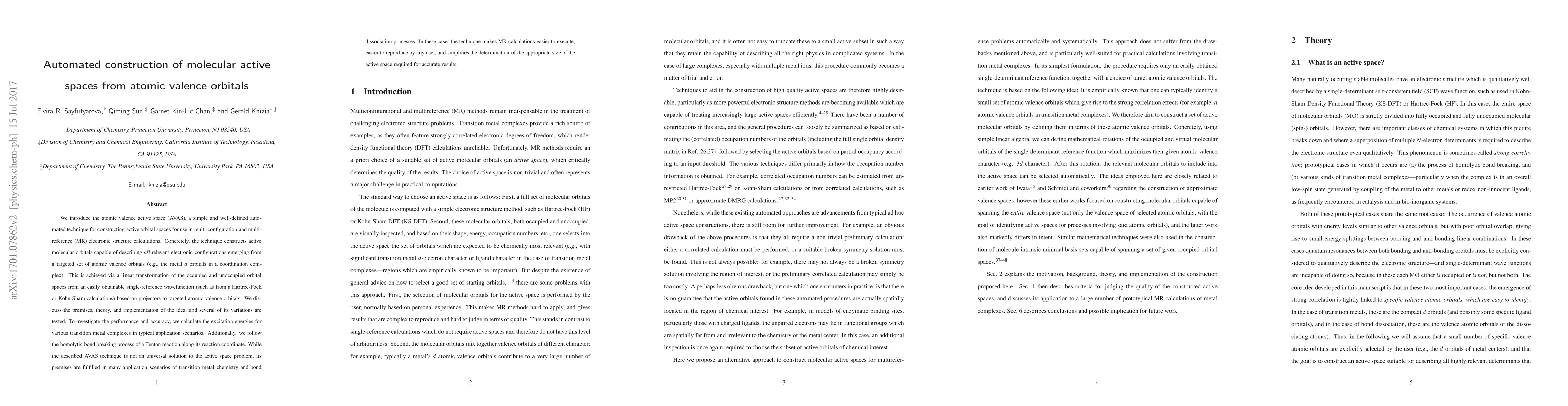 The paper introduces the atomic valence active space (AVAS) technique for automating the construction of active orbital spaces in multi-configuration electronic structure calculations, simplifying the determination of active spaces for transition metal complexes and bond dissociation processes. The method is tested on transition metal complexes and a Fenton reaction, demonstrating its utility in multi-reference calculations.