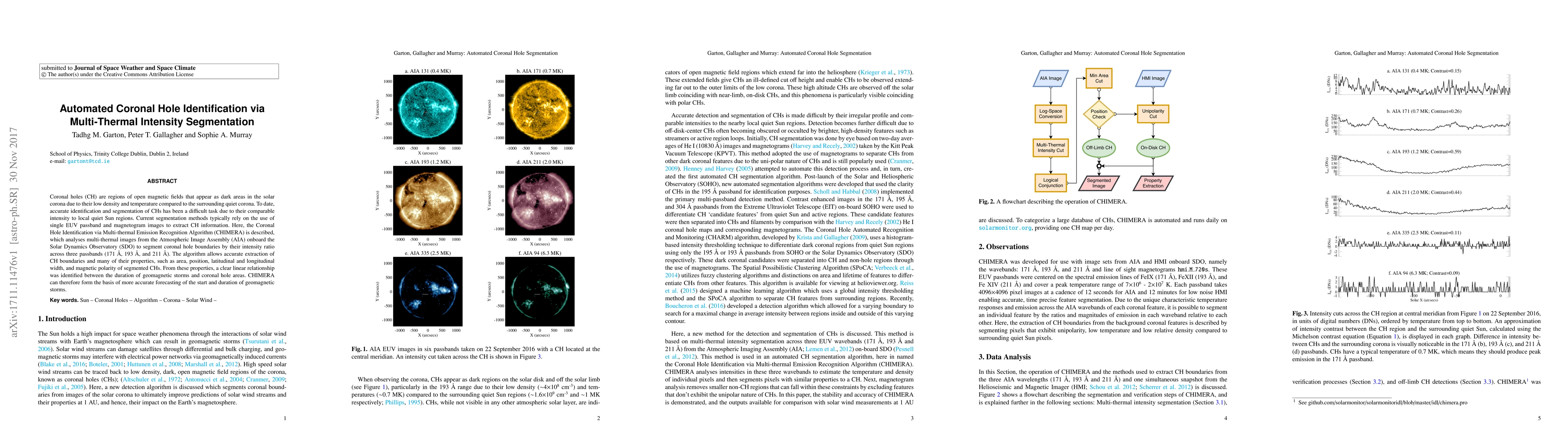 CHIMERA uses multi-thermal images from the SDO's AIA to accurately segment coronal holes (CH) based on intensity ratios across three passbands. This method enables precise extraction of CH properties, leading to better forecasting of geomagnetic storms.