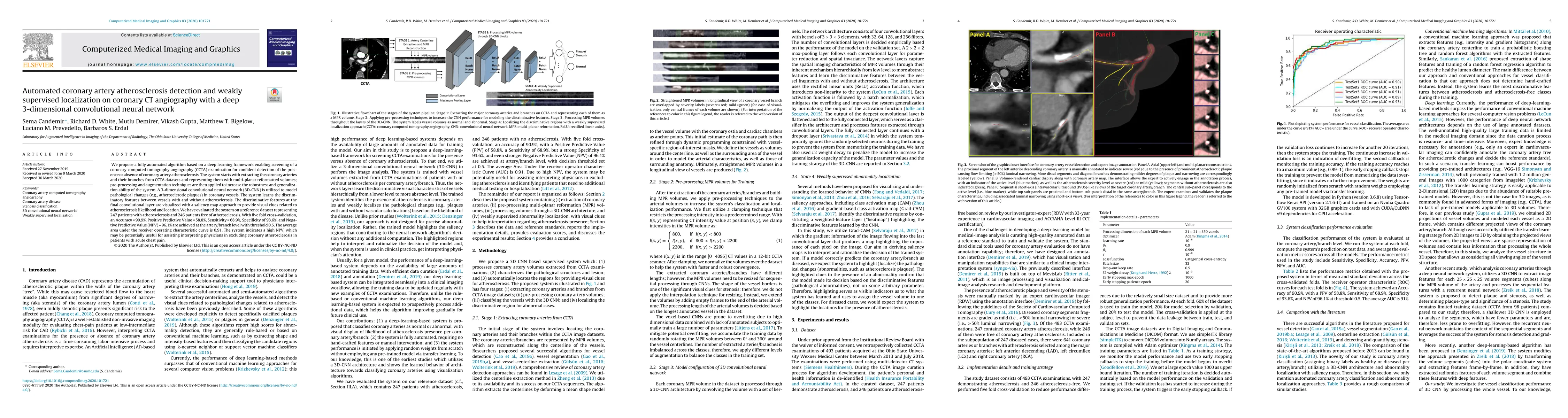 We propose a fully automated algorithm based on a deep learning framework enabling screening of a coronary computed tomography angiography (CCTA) examination for confident detection of the presence or absence of coronary artery atherosclerosis. The system starts with extracting the coronary arteries and their branches from CCTA datasets and representing them with multi-planar reformatted volumes; pre-processing and augmentation techniques are then applied to increase the robustness and generalization ability of the system. A 3-dimensional convolutional neural network (3D-CNN) is utilized to model pathological changes (e.g., atherosclerotic plaques) in coronary vessels. The system learns the discriminatory features between vessels with and without atherosclerosis. The discriminative features at the final convolutional layer are visualized with a saliency map approach to provide visual clues related to atherosclerosis likelihood and location. We have evaluated the system on a reference dataset representing247 patients with atherosclerosis and 246 patients free of atherosclerosis. With five-fold cross-validation,an Accuracy = 90.9%, Positive Predictive Value = 58.8%, Sensitivity = 68.9%, Specificity of 93.6%, and Negative Predictive Value (NPV) = 96.1% are achieved at the artery/branch level with threshold 0.5. The average area under the receiver operating characteristic curve is 0.91. The system indicates a high NPV, which may be potentially useful for assisting interpreting physicians in excluding coronary atherosclerosis in patients with acute chest pain.