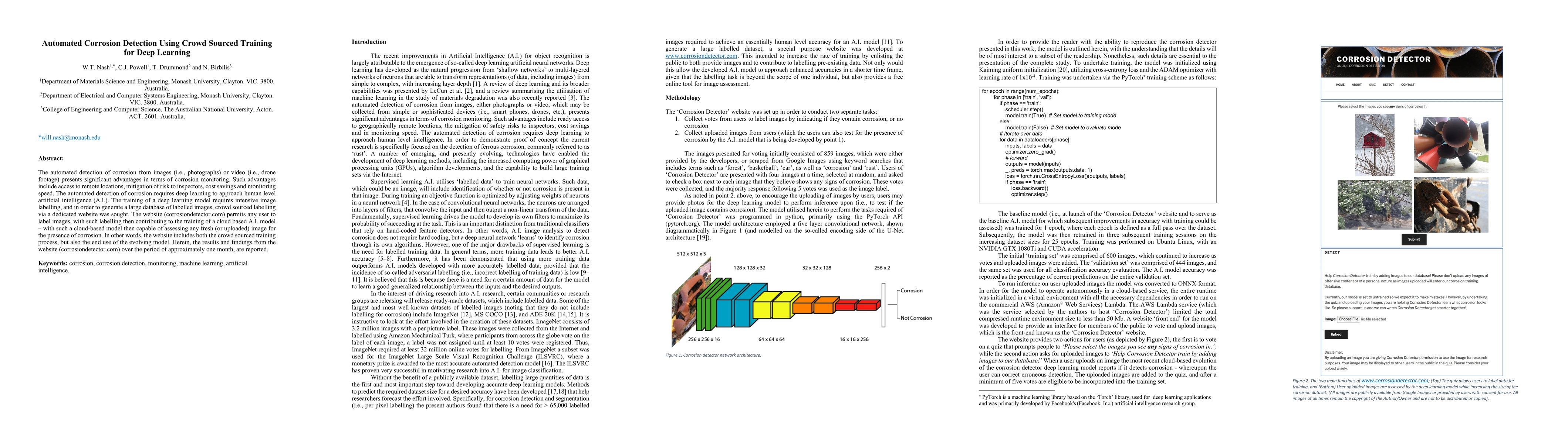 The automated detection of corrosion from images (i.e., photographs) or video (i.e., drone footage) presents significant advantages in terms of corrosion monitoring. Such advantages include access to remote locations, mitigation of risk to inspectors, cost savings and monitoring speed. The automated detection of corrosion requires deep learning to approach human level artificial intelligence (A.I.). The training of a deep learning model requires intensive image labelling, and in order to generate a large database of labelled images, crowd sourced labelling via a dedicated website was sought. The website (corrosiondetector.com) permits any user to label images, with such labelling then contributing to the training of a cloud based A.I. model - with such a cloud-based model then capable of assessing any fresh (or uploaded) image for the presence of corrosion. In other words, the website includes both the crowd sourced training process, but also the end use of the evolving model. Herein, the results and findings from the website (corrosiondetector.com) over the period of approximately one month, are reported.
