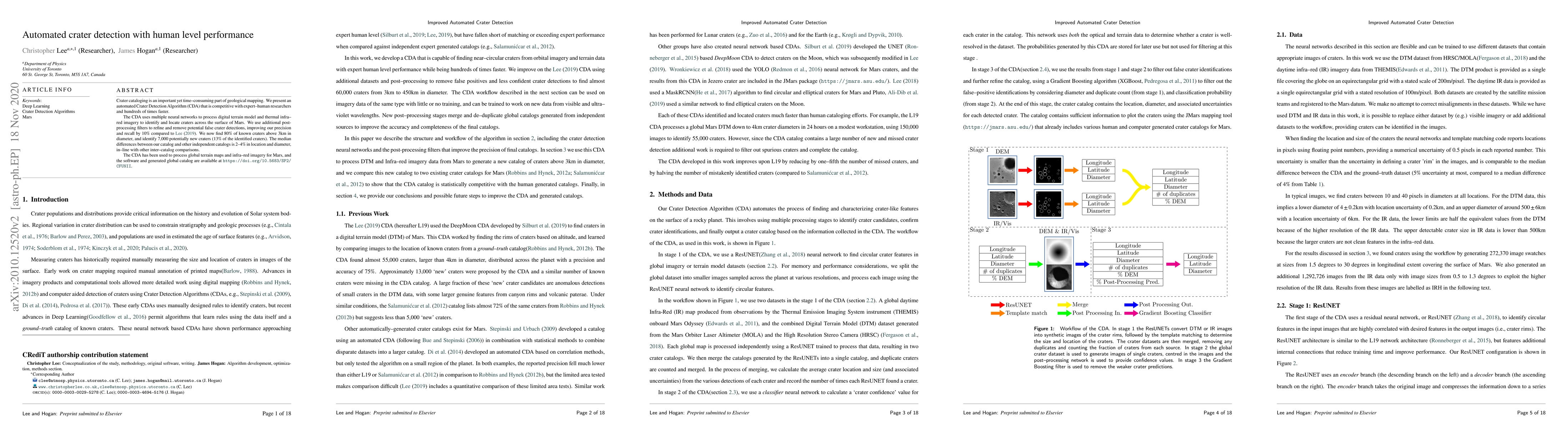 This paper introduces an Automated Crater Detection Algorithm (CDA) that rivals human experts in identifying Martian craters using neural networks and imagery. The CDA identifies 80% of known craters and has discovered 7,000 new potential craters, with a 10% improvement in precision compared to previous methods.