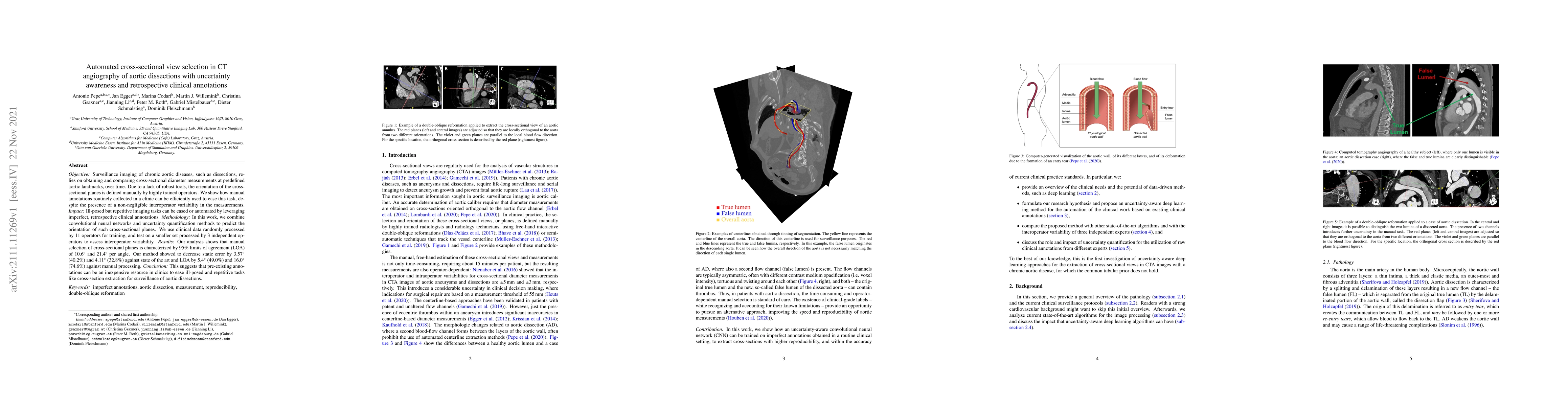 Objective: Surveillance imaging of chronic aortic diseases, such as dissections, relies on obtaining and comparing cross-sectional diameter measurements at predefined aortic landmarks, over time. Due to a lack of robust tools, the orientation of the cross-sectional planes is defined manually by highly trained operators. We show how manual annotations routinely collected in a clinic can be efficiently used to ease this task, despite the presence of a non-negligible interoperator variability in the measurements. Impact: Ill-posed but repetitive imaging tasks can be eased or automated by leveraging imperfect, retrospective clinical annotations. Methodology: In this work, we combine convolutional neural networks and uncertainty quantification methods to predict the orientation of such cross-sectional planes. We use clinical data randomly processed by 11 operators for training, and test on a smaller set processed by 3 independent operators to assess interoperator variability. Results: Our analysis shows that manual selection of cross-sectional planes is characterized by 95% limits of agreement (LOA) of $10.6^\circ$ and $21.4^\circ$ per angle. Our method showed to decrease static error by $3.57^\circ$ ($40.2$%) and $4.11^\circ$ ($32.8$%) against state of the art and LOA by $5.4^\circ$ ($49.0$%) and $16.0^\circ$ ($74.6$%) against manual processing. Conclusion: This suggests that pre-existing annotations can be an inexpensive resource in clinics to ease ill-posed and repetitive tasks like cross-section extraction for surveillance of aortic dissections.