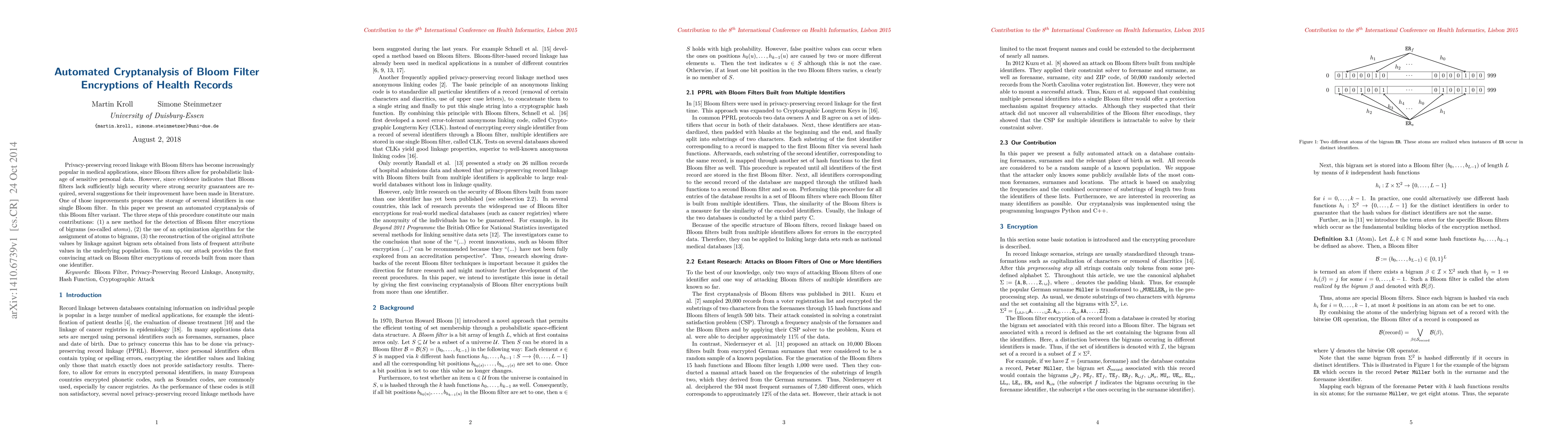Privacy-preserving record linkage with Bloom filters has become increasingly popular in medical applications, since Bloom filters allow for probabilistic linkage of sensitive personal data. However, since evidence indicates that Bloom filters lack sufficiently high security where strong security guarantees are required, several suggestions for their improvement have been made in literature. One of those improvements proposes the storage of several identifiers in one single Bloom filter. In this paper we present an automated cryptanalysis of this Bloom filter variant. The three steps of this procedure constitute our main contributions: (1) a new method for the detection of Bloom filter encrytions of bigrams (so-called atoms), (2) the use of an optimization algorithm for the assignment of atoms to bigrams, (3) the reconstruction of the original attribute values by linkage against bigram sets obtained from lists of frequent attribute values in the underlying population. To sum up, our attack provides the first convincing attack on Bloom filter encryptions of records built from more than one identifier.