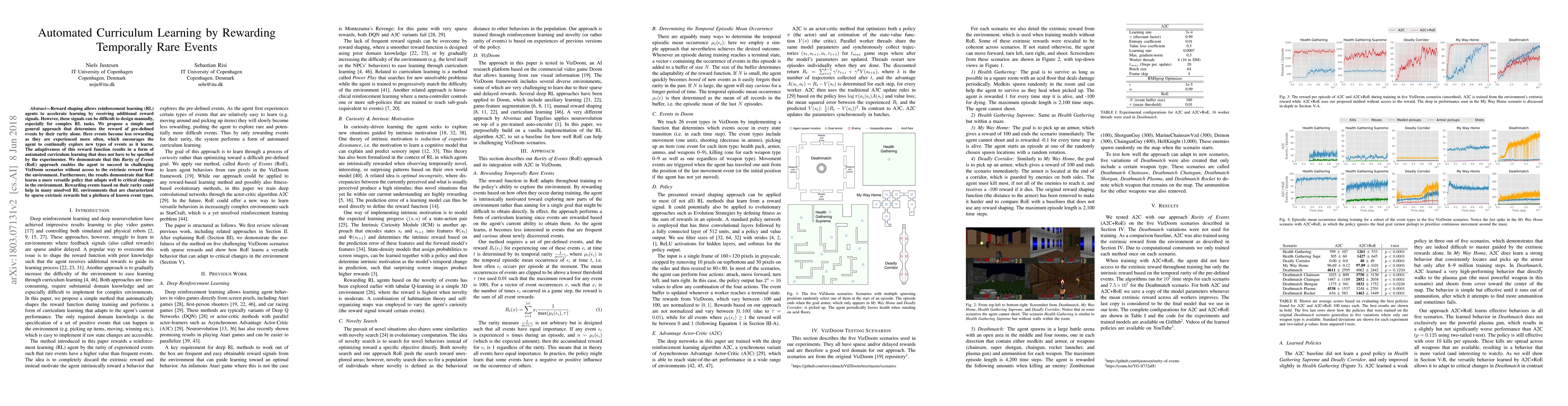 This research introduces a novel method, Rarity of Events (RoE), for automated curriculum learning in reinforcement learning (RL). RoE rewards events based on their rarity, encouraging continuous exploration. It successfully enables RL agents to tackle complex VizDoom scenarios without relying on environment rewards, and learns versatile policies adaptable to environmental changes.