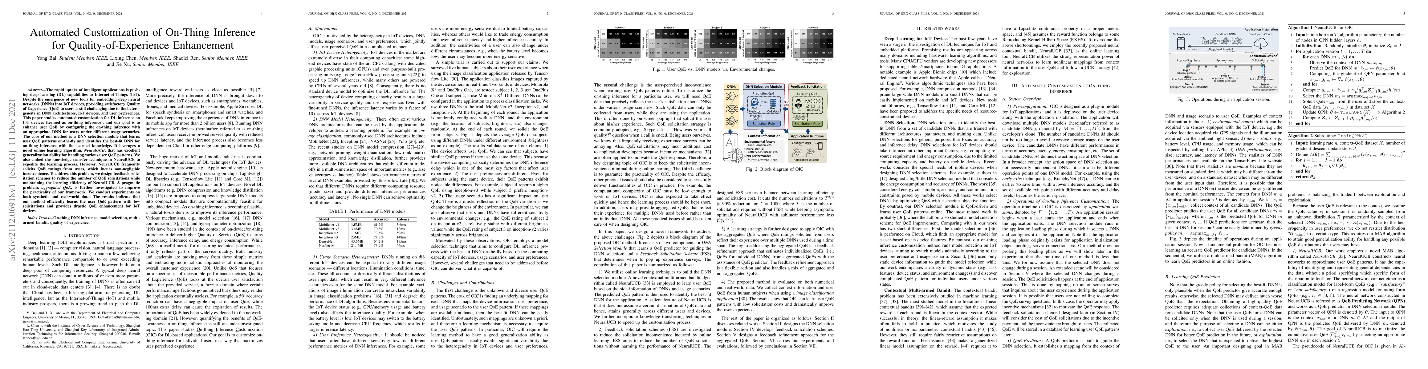 The rapid uptake of intelligent applications is pushing deep learning (DL) capabilities to Internet-of-Things (IoT). Despite the emergence of new tools for embedding deep neural networks (DNNs) into IoT devices, providing satisfactory Quality of Experience (QoE) to users is still challenging due to the heterogeneity in DNN architectures, IoT devices, and user preferences. This paper studies automated customization for DL inference on IoT devices (termed as on-thing inference), and our goal is to enhance user QoE by configuring the on-thing inference with an appropriate DNN for users under different usage scenarios. The core of our method is a DNN selection module that learns user QoE patterns on-the-fly and identifies the best-fit DNN for on-thing inference with the learned knowledge. It leverages a novel online learning algorithm, NeuralUCB, that has excellent generalization ability for handling various user QoE patterns. We also embed the knowledge transfer technique in NeuralUCB to expedite the learning process. However, NeuralUCB frequently solicits QoE ratings from users, which incurs non-negligible inconvenience. To address this problem, we design feedback solicitation schemes to reduce the number of QoE solicitations while maintaining the learning efficiency of NeuralUCB. A pragmatic problem, aggregated QoE, is further investigated to improve the practicality of our framework. We conduct experiments on both synthetic and real-world data. The results indicate that our method efficiently learns the user QoE pattern with few solicitations and provides drastic QoE enhancement for IoT devices.