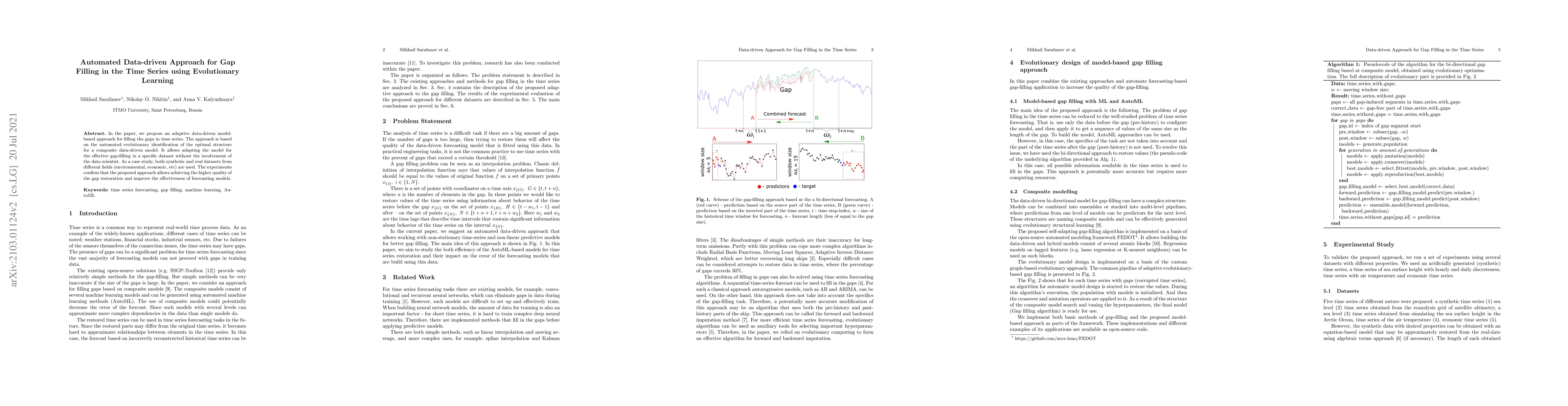 This paper introduces an automated, data-driven method for filling gaps in time series using evolutionary learning, which identifies the optimal model structure without data scientist intervention. Experiments on synthetic and real datasets show improved gap restoration and enhanced forecasting model effectiveness.