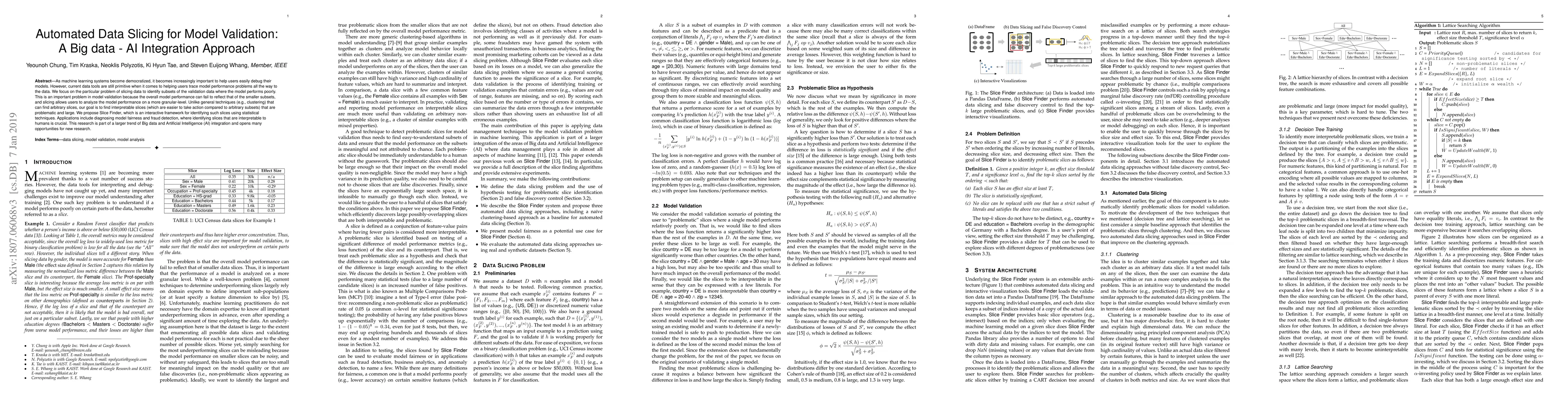 As machine learning systems become democratized, it becomes increasingly important to help users easily debug their models. However, current data tools are still primitive when it comes to helping users trace model performance problems all the way to the data. We focus on the particular problem of slicing data to identify subsets of the validation data where the model performs poorly. This is an important problem in model validation because the overall model performance can fail to reflect that of the smaller subsets, and slicing allows users to analyze the model performance on a more granular-level. Unlike general techniques (e.g., clustering) that can find arbitrary slices, our goal is to find interpretable slices (which are easier to take action compared to arbitrary subsets) that are problematic and large. We propose Slice Finder, which is an interactive framework for identifying such slices using statistical techniques. Applications include diagnosing model fairness and fraud detection, where identifying slices that are interpretable to humans is crucial. This research is part of a larger trend of Big data and Artificial Intelligence (AI) integration and opens many opportunities for new research.