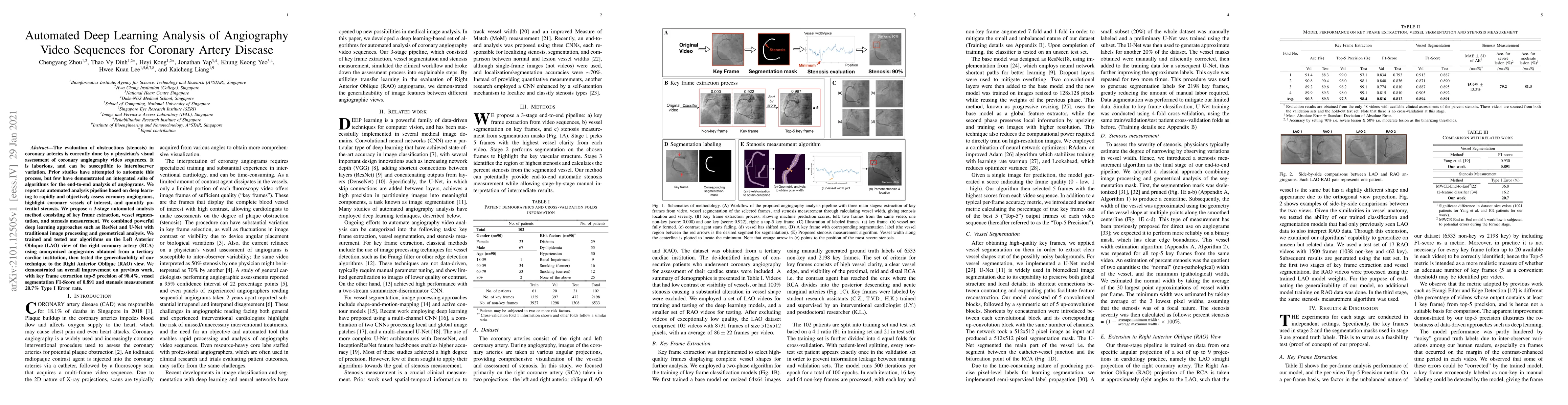 This paper presents an automated deep learning pipeline for analyzing coronary angiography videos to detect coronary artery disease, featuring key frame extraction, vessel segmentation, and stenosis measurement. The proposed method combines deep learning algorithms with traditional image processing, showing improved accuracy and generalizability across different views.