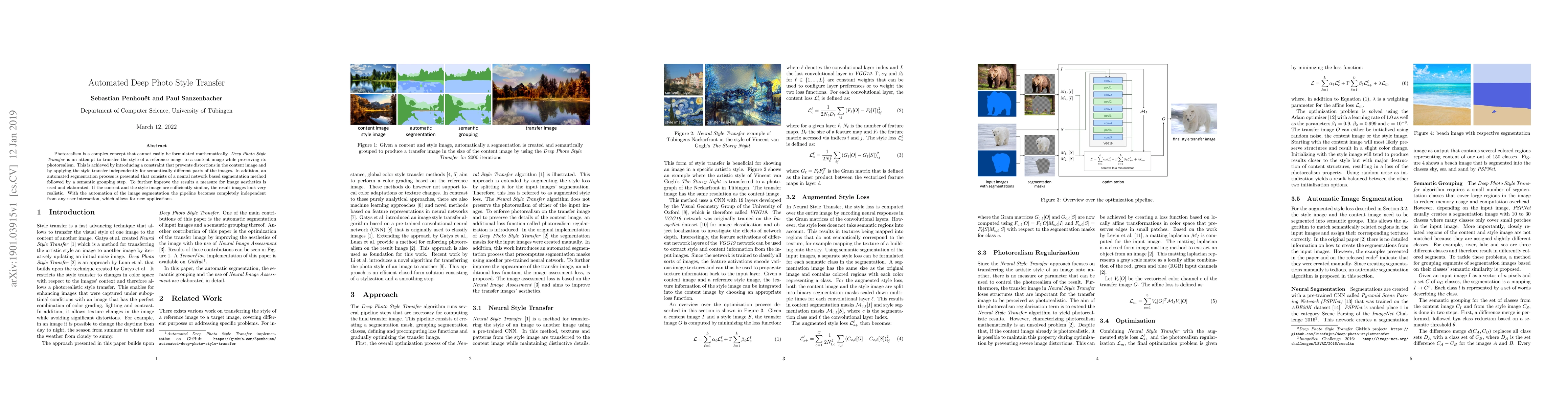 This paper presents a method for automated deep photo style transfer that maintains photorealism by segmenting images into semantically different parts and applying style transfer accordingly. An automated segmentation process and a measure for image aesthetics enhance the realism of the results, enabling fully automated, user-independent style transfer for new applications.