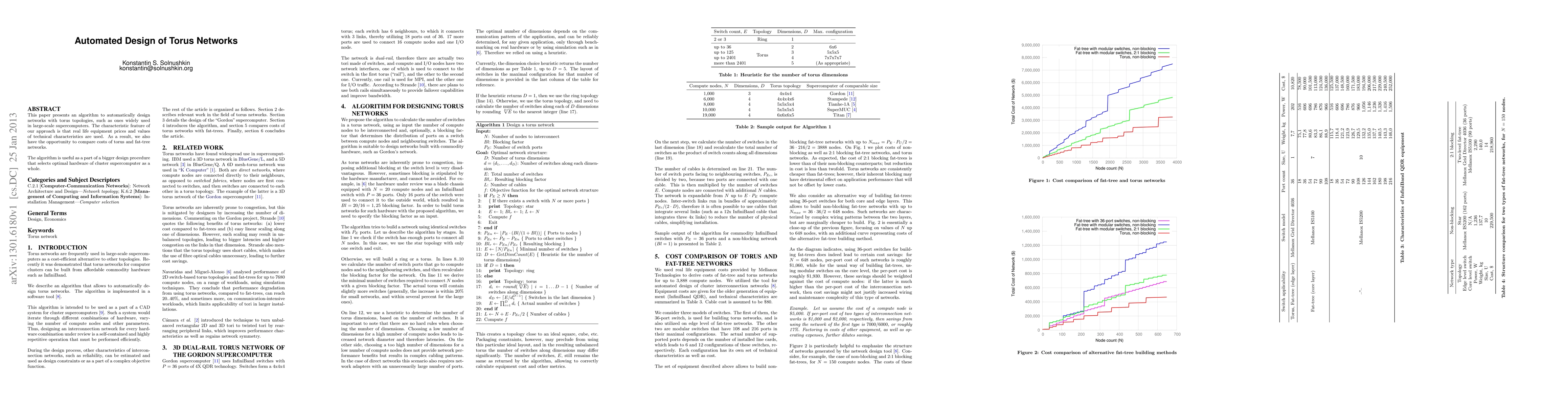 This paper presents an algorithm to automatically design networks with torus topologies, such as ones widely used in large-scale supercomputers. The characteristic feature of our approach is that real life equipment prices and values of technical characteristics are used. As a result, we also have the opportunity to compare costs of torus and fat-tree networks. The algorithm is useful as a part of a bigger design procedure that selects optimal hardware of cluster supercomputer as a whole.