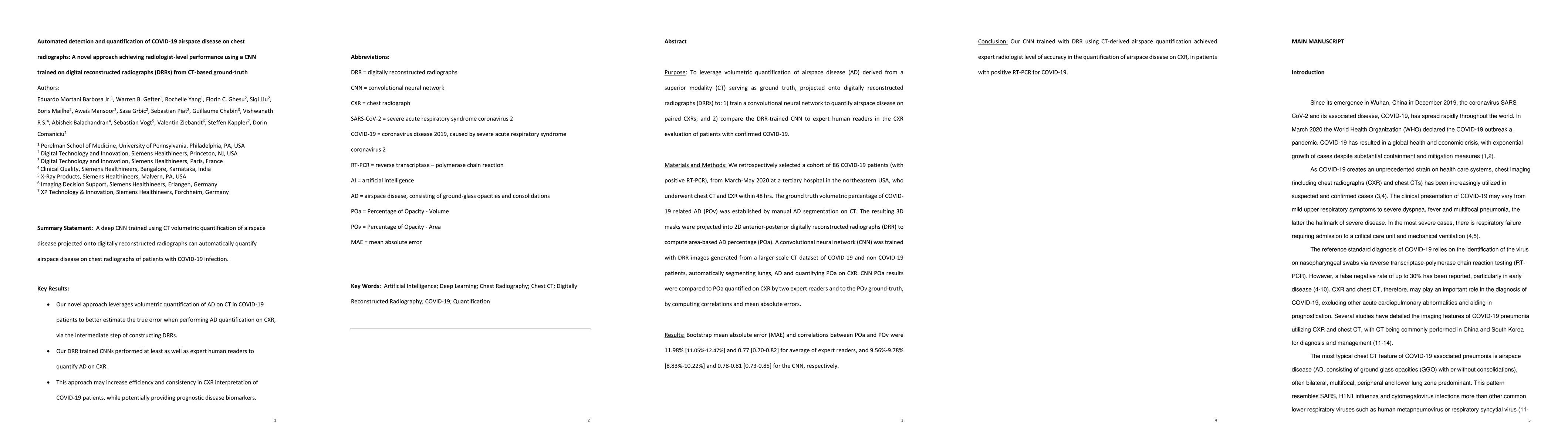 This research paper presents a novel convolutional neural network (CNN) that uses digitally reconstructed radiographs (DRRs) from CT scans to achieve radiologist-level performance in detecting and quantifying COVID-19 airspace disease on chest radiographs. The CNN was trained on a large dataset and demonstrated high accuracy in comparison to expert radiologists, suggesting its potential for aiding in the diagnosis of COVID-19.