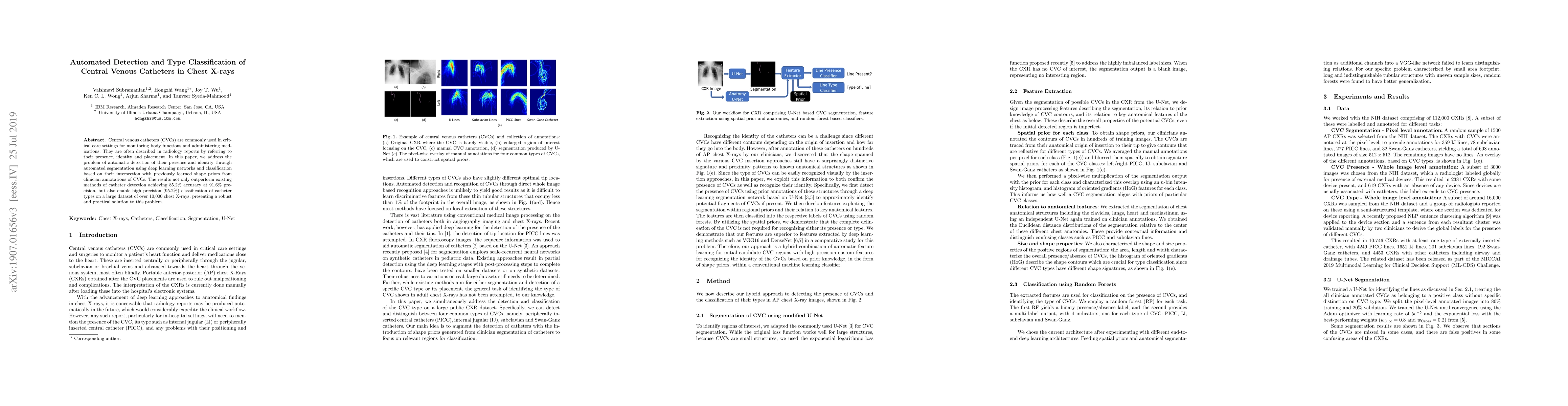 Central venous catheters (CVCs) are commonly used in critical care settings for monitoring body functions and administering medications. They are often described in radiology reports by referring to their presence, identity and placement. In this paper, we address the problem of automatic detection of their presence and identity through automated segmentation using deep learning networks and classification based on their intersection with previously learned shape priors from clinician annotations of CVCs. The results not only outperform existing methods of catheter detection achieving 85.2% accuracy at 91.6% precision, but also enable high precision (95.2%) classification of catheter types on a large dataset of over 10,000 chest X-rays, presenting a robust and practical solution to this problem.