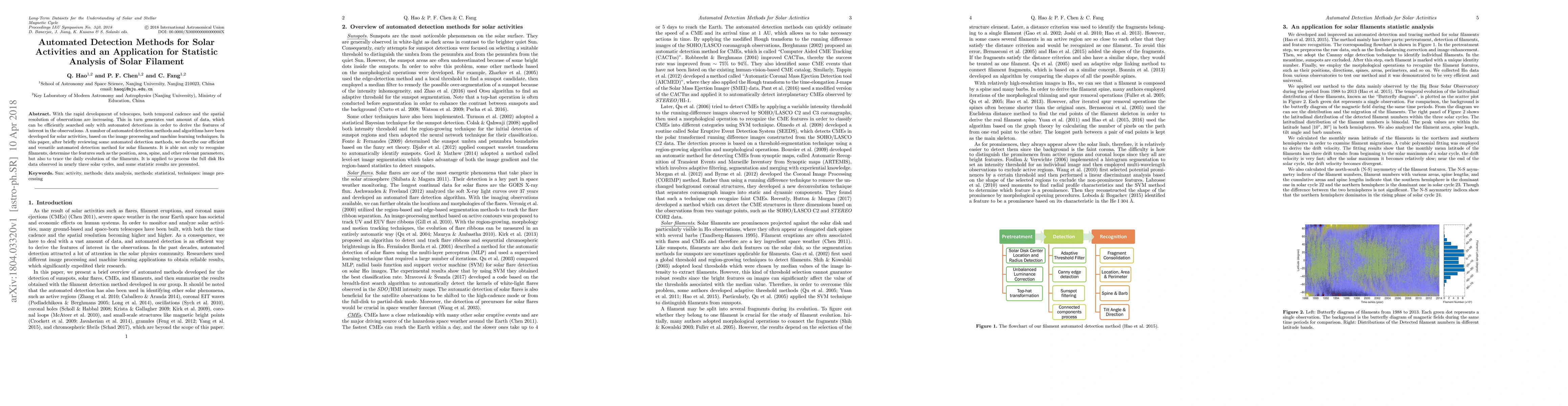 This paper reviews automated detection methods for solar activities and introduces a new efficient algorithm for identifying and analyzing solar filaments using image processing and machine learning. The method recognizes and tracks filament features over time, applied to H-alpha data from nearly three solar cycles, yielding statistical insights.