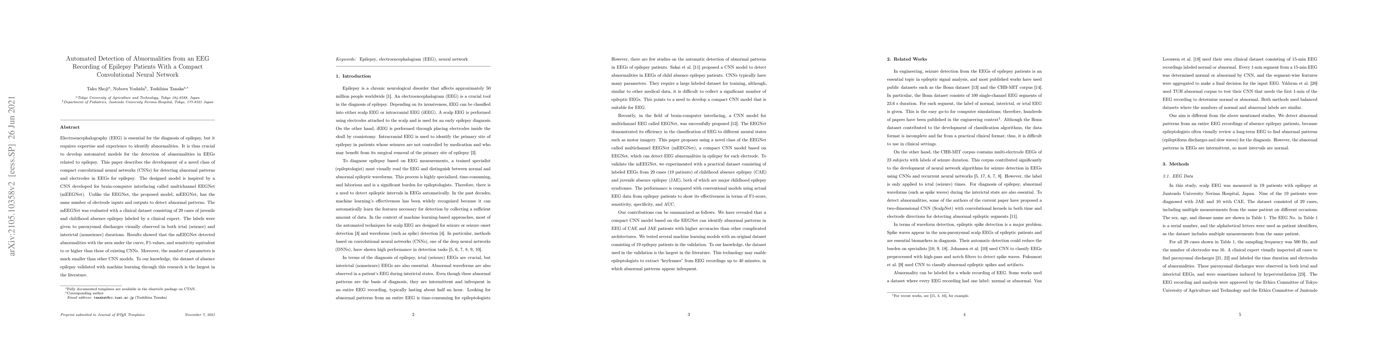 Electroencephalography (EEG) is essential for the diagnosis of epilepsy, but it requires expertise and experience to identify abnormalities. It is thus crucial to develop automated models for the detection of abnormalities in EEGs related to epilepsy. This paper describes the development of a novel class of compact convolutional neural networks (CNNs) for detecting abnormal patterns and electrodes in EEGs for epilepsy. The designed model is inspired by a CNN developed for brain-computer interfacing called multichannel EEGNet (mEEGNet). Unlike the EEGNet, the proposed model, mEEGNet, has the same number of electrode inputs and outputs to detect abnormal patterns. The mEEGNet was evaluated with a clinical dataset consisting of 29 cases of juvenile and childhood absence epilepsy labeled by a clinical expert. The labels were given to paroxysmal discharges visually observed in both ictal (seizure) and interictal (nonseizure) durations. Results showed that the mEEGNet detected abnormalities with the area under the curve, F1-values, and sensitivity equivalent to or higher than those of existing CNNs. Moreover, the number of parameters is much smaller than other CNN models. To our knowledge, the dataset of absence epilepsy validated with machine learning through this research is the largest in the literature.
