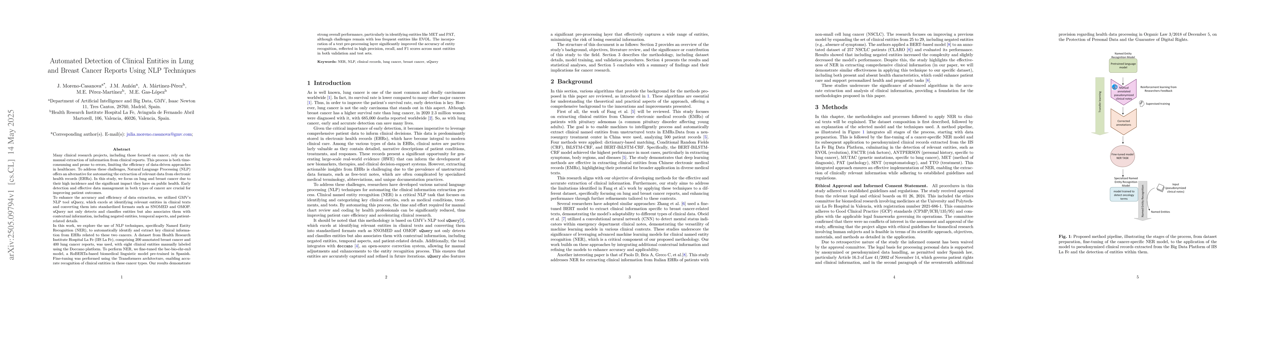 This research automates the extraction of crucial clinical data from lung and breast cancer reports using NLP. By fine-tuning a RoBERTa-based model, the study achieved high accuracy in identifying entities such as MET and PAT, aiming to improve data management and patient outcomes in these high-incidence cancers.