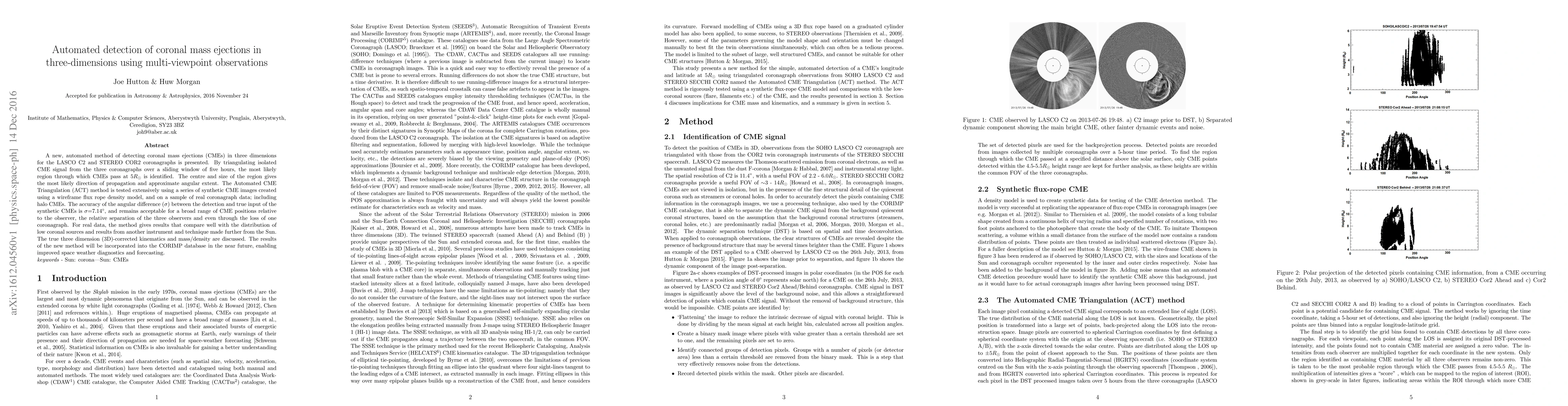 This paper introduces an automated method, ACT, for detecting coronal mass ejections in three dimensions using multi-viewpoint observations from LASCO C2 and STEREO COR2 coronagraphs. The method triangulates CME signals over five hours to identify the most likely propagation direction and angular extent.