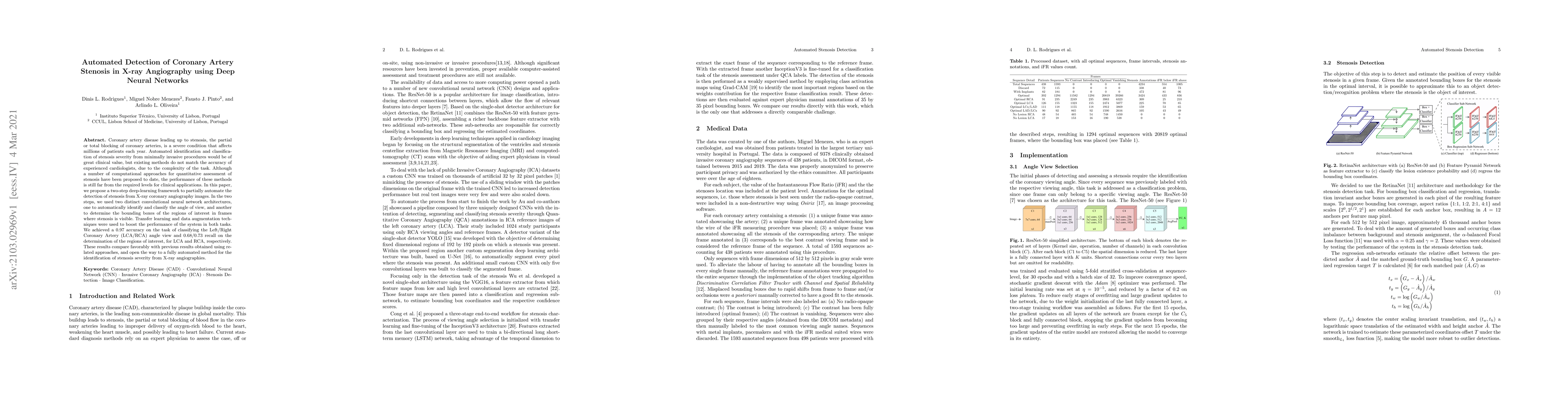 This paper proposes a deep-learning framework for automated detection of coronary artery stenosis in X-ray angiography, utilizing two convolutional neural networks to classify artery angles and identify regions of interest. The method achieves high accuracy and recall rates, outperforming previous computational approaches and showing potential for clinical use.