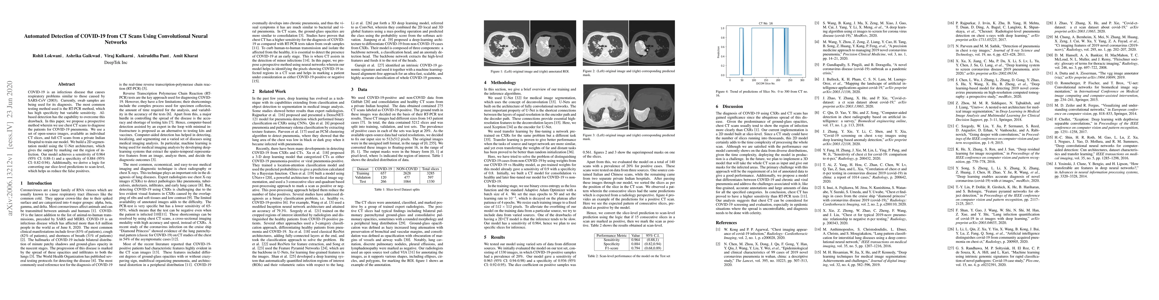 This paper proposes a convolutional neural network using U-Net architecture to detect COVID-19 pneumonia from chest CT scans, achieving high sensitivity and specificity. The model reduces false positives by converting slice-level predictions to scan-level assessments.