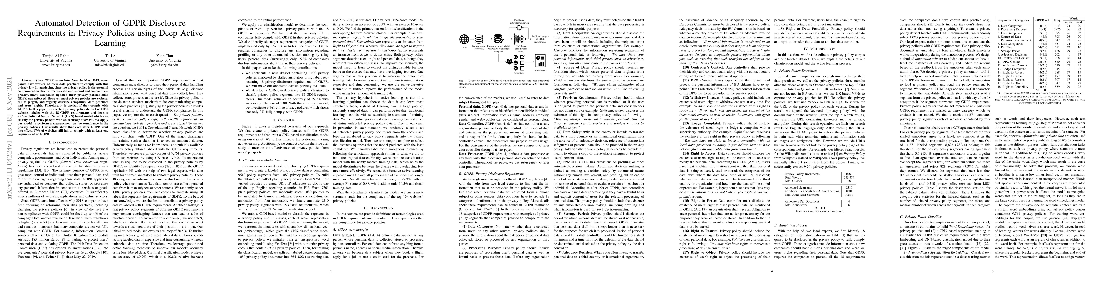 This paper develops a CNN-based model using deep active learning to automatically detect GDPR compliance in privacy policies, achieving 89.2% accuracy. Despite GDPR enforcement, the study finds that 97% of analyzed websites still fail to meet at least one GDPR requirement.