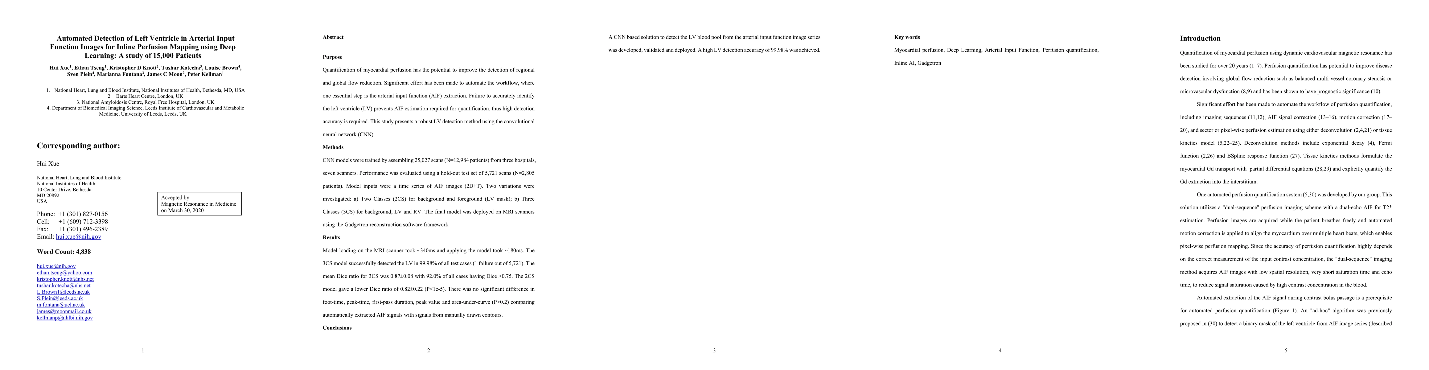 A deep learning model successfully detected left ventricle in arterial input function images with high accuracy for clinical perfusion mapping, achieving 99.98% correct detection rate.
