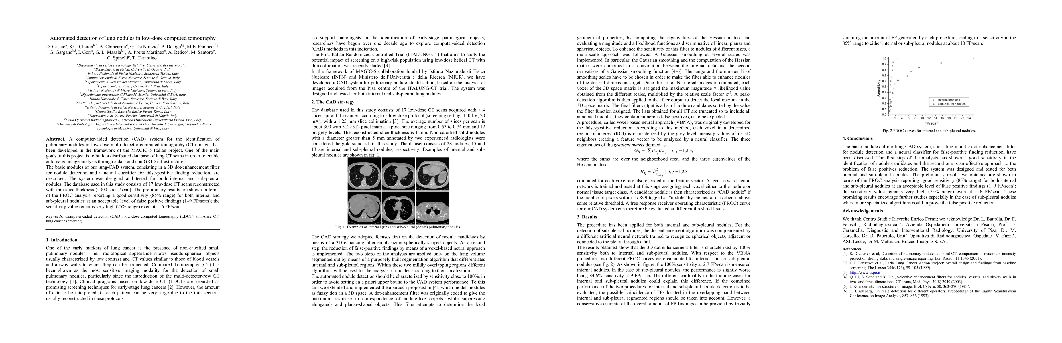 This paper presents a CAD system for detecting pulmonary nodules in low-dose CT scans, developed within the MAGIC-5 project. The system employs a 3D dot-enhancement filter and a neural classifier, achieving high sensitivity (85%) and low false positives (1-9 FP/scan).