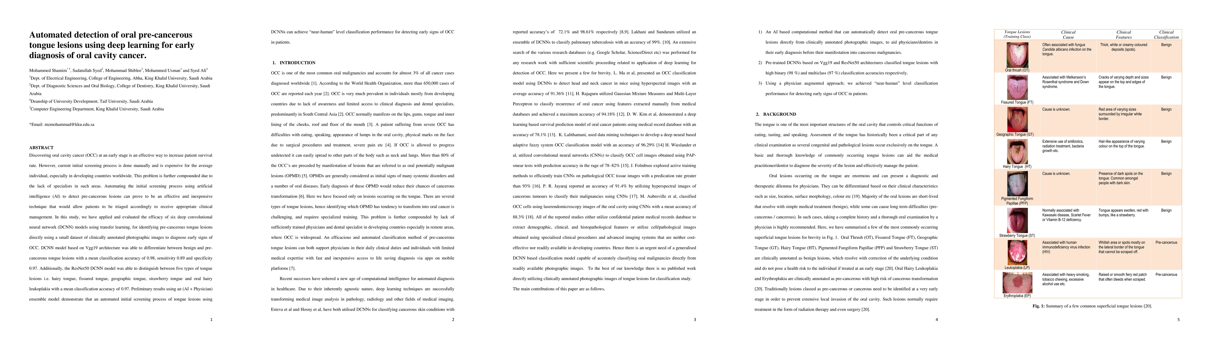 The research applied and evaluated six deep convolutional neural network (DCNN) models using transfer learning for identifying pre-cancerous tongue lesions from a small dataset of clinically annotated photographic images to diagnose early signs of oral cavity cancer (OCC).
