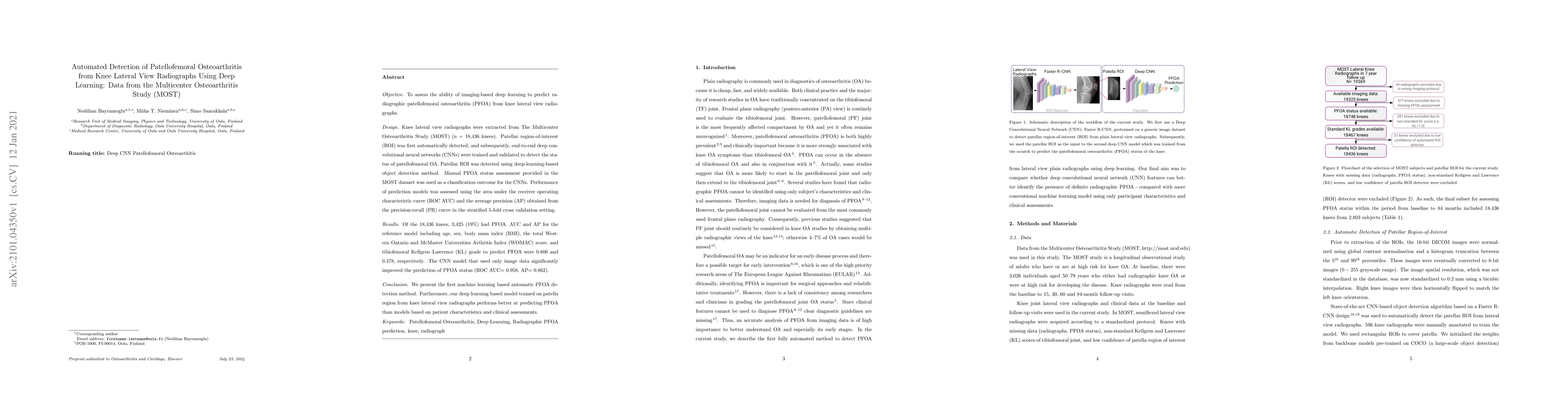 This study developed a deep convolutional neural network to automatically detect patellofemoral osteoarthritis (PFOA) from knee lateral view radiographs using data from the Multicenter Osteoarthritis Study (MOST). The deep learning model significantly outperformed traditional models based on patient characteristics, achieving a ROC AUC of 0.958 and an average precision of 0.862.