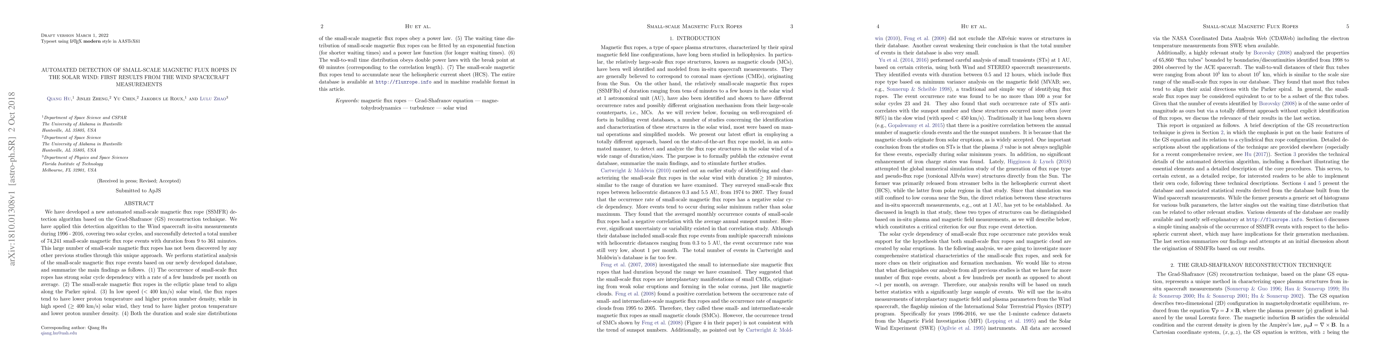 This paper presents a new automated algorithm for detecting small-scale magnetic flux ropes in the solar wind using Wind spacecraft data from 1996-2016, identifying 74,241 events. The study reveals significant statistical properties, including solar cycle dependency, alignment with the Parker spiral, and variations in proton temperature and density based on solar wind speed.