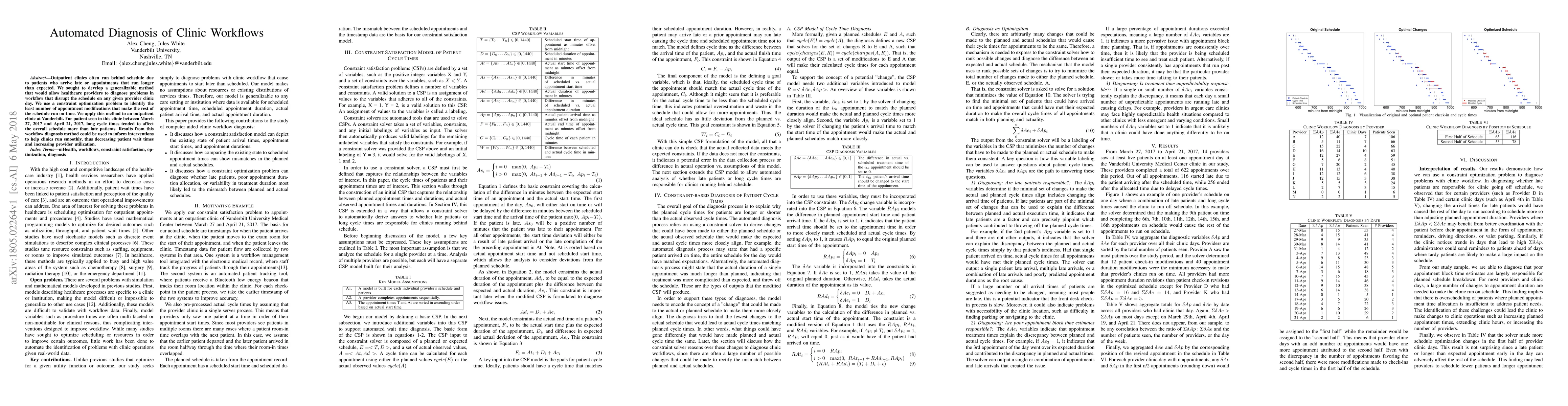 The paper introduces a novel application of constraint satisfaction problems (CSP) to diagnose workflow issues in clinic schedules, extending traditional CSPs to include goal variables for identifying discrepancies between planned and actual cycle times.