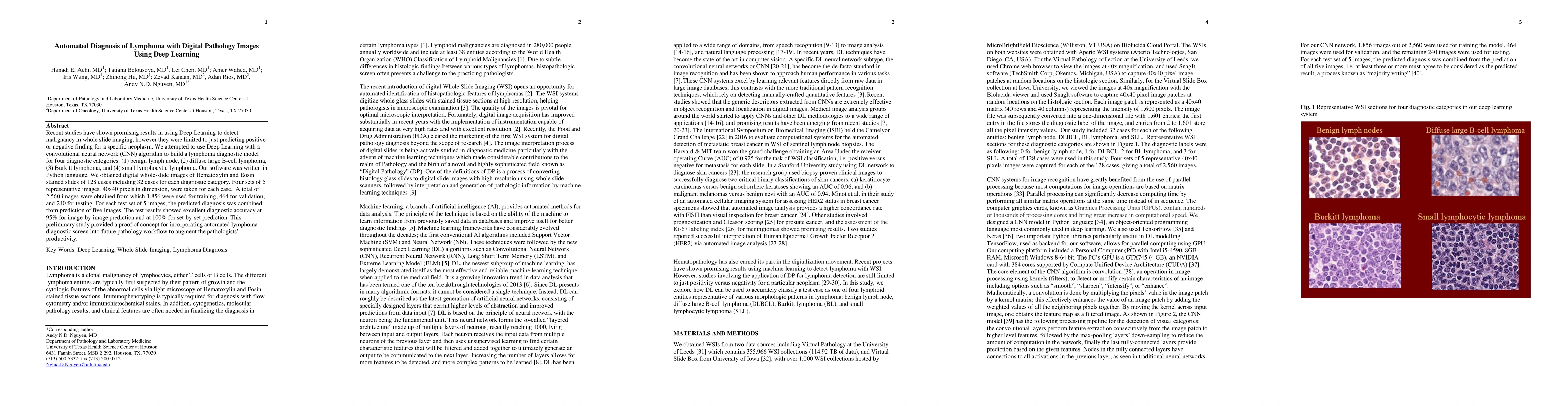This study developed a deep learning convolutional neural network model to diagnose four types of lymphoma from digital pathology images, achieving 95% accuracy for individual image predictions and 10% accuracy for set-based predictions. The preliminary results suggest potential for enhancing pathologist productivity through automated diagnostic screening.