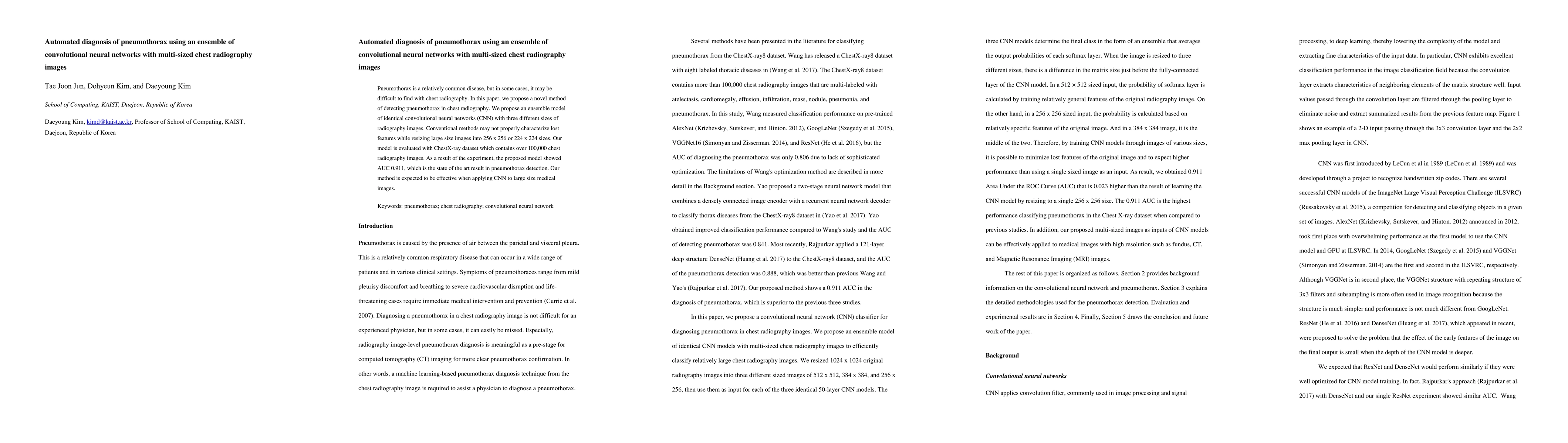 This research introduces an innovative ensemble of convolutional neural networks (CNNs) to detect pneumothorax in chest radiography using multi-sized images. The proposed model achieved a state-of-the-art AUC of 0.911, demonstrating its effectiveness in handling large medical images and potentially improving pneumothorax diagnosis accuracy.