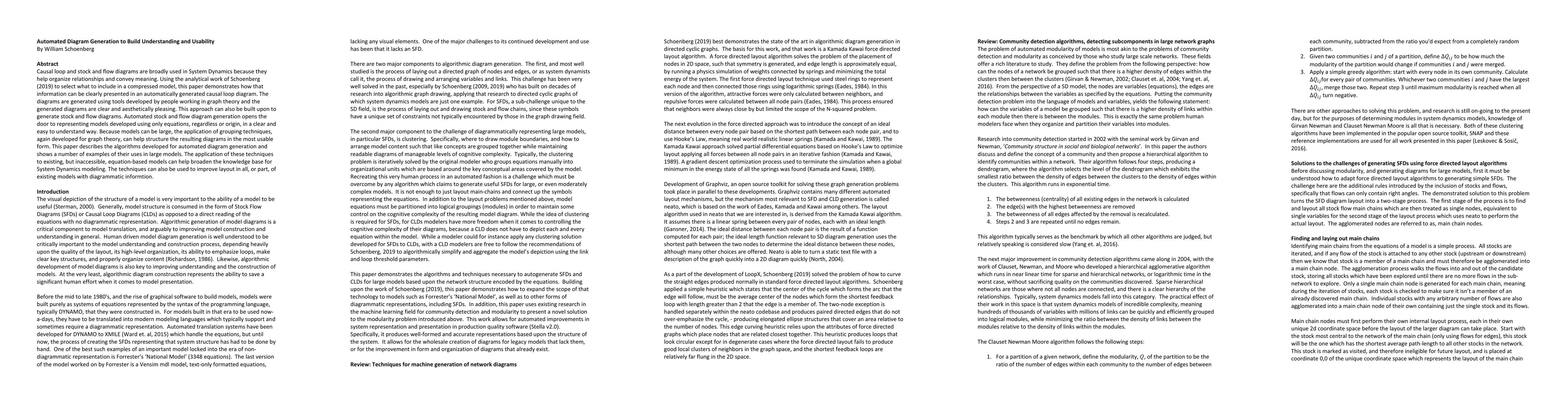 Causal loop and stock and flow diagrams are broadly used in System Dynamics because they help organize relationships and convey meaning. Using the analytical work of Schoenberg (2019) to select what to include in a compressed model, this paper demonstrates how that information can be clearly presented in an automatically generated causal loop diagram. The diagrams are generated using tools developed by people working in graph theory and the generated diagrams are clear and aesthetically pleasing. This approach can also be built upon to generate stock and flow diagrams. Automated stock and flow diagram generation opens the door to representing models developed using only equations, regardless or origin, in a clear and easy to understand way. Because models can be large, the application of grouping techniques, again developed for graph theory, can help structure the resulting diagrams in the most usable form. This paper describes the algorithms developed for automated diagram generation and shows a number of examples of their uses in large models. The application of these techniques to existing, but inaccessible, equation-based models can help broaden the knowledge base for System Dynamics modeling. The techniques can also be used to improve layout in all, or part, of existing models with diagrammatic informtion.