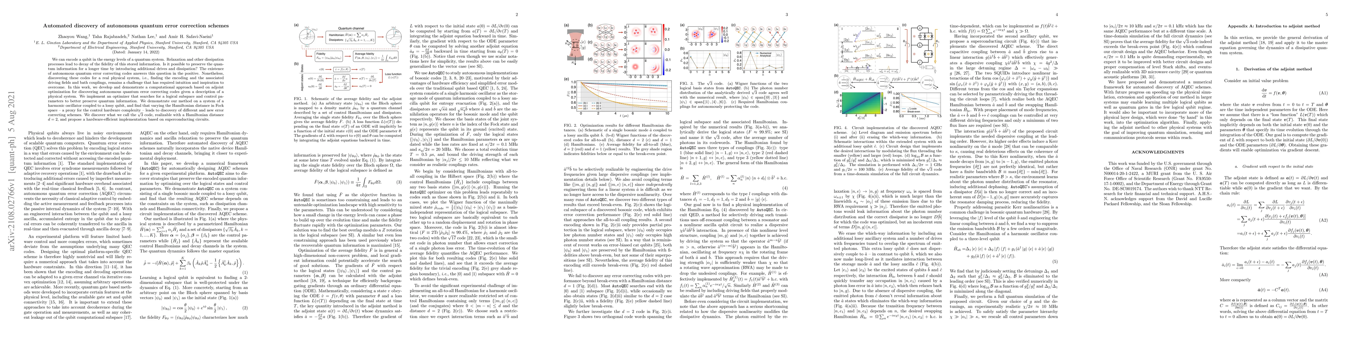 We can encode a qubit in the energy levels of a quantum system. Relaxation and other dissipation processes lead to decay of the fidelity of this stored information. Is it possible to preserve the quantum information for a longer time by introducing additional drives and dissipation? The existence of autonomous quantum error correcting codes answers this question in the positive. Nonetheless, discovering these codes for a real physical system, i.e., finding the encoding and the associated driving fields and bath couplings, remains a challenge that has required intuition and inspiration to overcome. In this work, we develop and demonstrate a computational approach based on adjoint optimization for discovering autonomous quantum error correcting codes given a description of a physical system. We implement an optimizer that searches for a logical subspace and control parameters to better preserve quantum information. We demonstrate our method on a system of a harmonic oscillator coupled to a lossy qubit, and find that varying the Hamiltonian distance in Fock space -- a proxy for the control hardware complexity -- leads to discovery of different and new error correcting schemes. We discover what we call the $\sqrt{3}$ code, realizable with a Hamiltonian distance $d=2$, and propose a hardware-efficient implementation based on superconducting circuits.