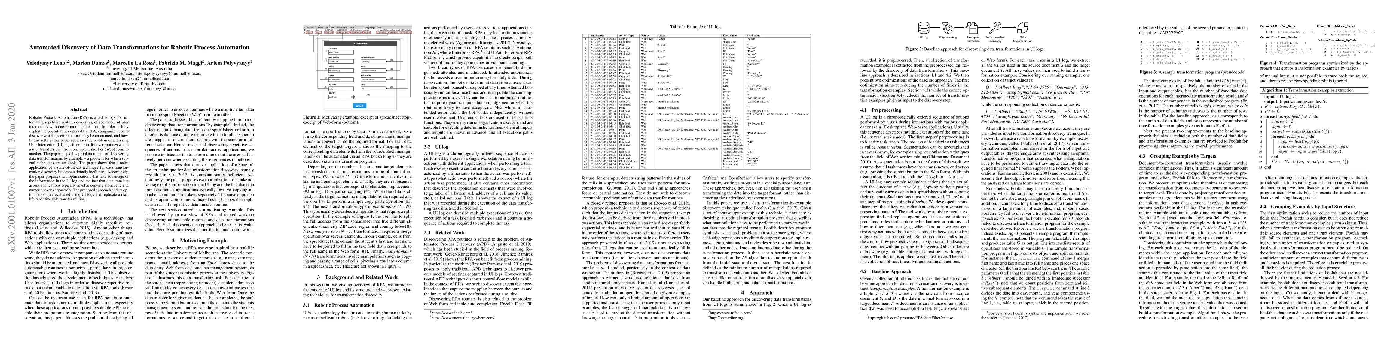 This paper explores automated discovery of data transformations for Robotic Process Automation (RPA) by analyzing User Interaction logs to identify repetitive data transfer routines. It proposes optimizations to improve the efficiency of data transformation discovery, demonstrating their effectiveness through evaluation on real-life repetitive data transfer logs.