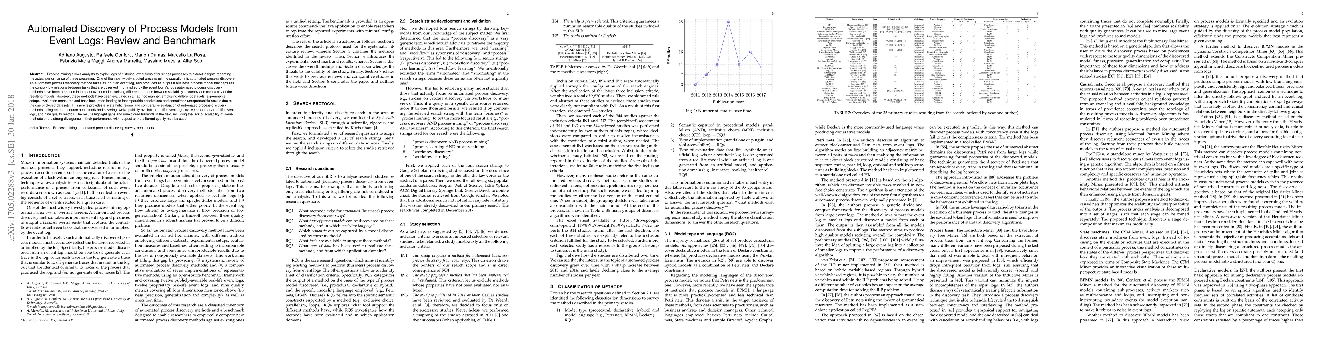 This paper reviews and benchmarks automated process discovery methods, comparing them using an open-source benchmark with publicly and proprietary event logs, and nine quality metrics. It highlights scalability issues and performance divergences among methods, revealing gaps in current research.