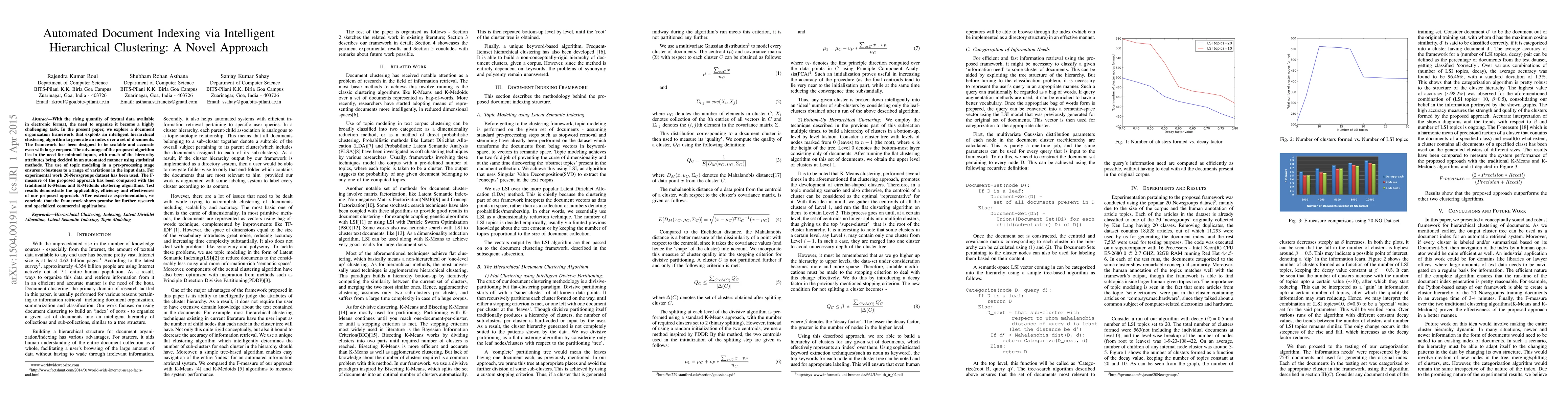 With the rising quantity of textual data available in electronic format, the need to organize it become a highly challenging task. In the present paper, we explore a document organization framework that exploits an intelligent hierarchical clustering algorithm to generate an index over a set of documents. The framework has been designed to be scalable and accurate even with large corpora. The advantage of the proposed algorithm lies in the need for minimal inputs, with much of the hierarchy attributes being decided in an automated manner using statistical methods. The use of topic modeling in a pre-processing stage ensures robustness to a range of variations in the input data. For experimental work 20-Newsgroups dataset has been used. The F- measure of the proposed approach has been compared with the traditional K-Means and K-Medoids clustering algorithms. Test results demonstrate the applicability, efficiency and effectiveness of our proposed approach. After extensive experimentation, we conclude that the framework shows promise for further research and specialized commercial applications.