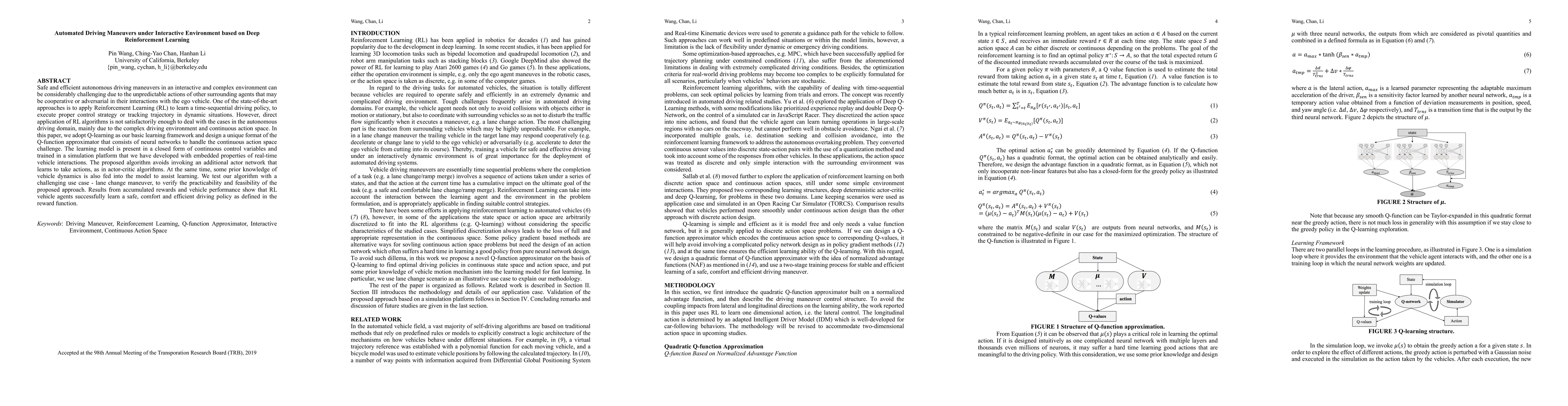 Safe and efficient autonomous driving maneuvers in an interactive and complex environment can be considerably challenging due to the unpredictable actions of other surrounding agents that may be cooperative or adversarial in their interactions with the ego vehicle. One of the state-of-the-art approaches is to apply Reinforcement Learning (RL) to learn a time-sequential driving policy, to execute proper control strategy or tracking trajectory in dynamic situations. However, direct application of RL algorithms is not satisfactorily enough to deal with the cases in the autonomous driving domain, mainly due to the complex driving environment and continuous action space. In this paper, we adopt Q-learning as our basic learning framework and design a unique format of the Q-function approximator that consists of neural networks to handle the continuous action space challenge. The learning model is present in a closed form of continuous control variables and trained in a simulation platform that we have developed with embedded properties of real-time vehicle interactions. The proposed algorithm avoids invoking an additional actor network that learns to take actions, as in actor-critic algorithms. At the same time, some prior knowledge of vehicle dynamics is also fed into the model to assist learning. We test our algorithm with a challenging use case - lane change maneuver, to verify the practicability and feasibility of the proposed approach. Results from accumulated rewards and vehicle performance show that RL vehicle agents successfully learn a safe, comfort and efficient driving policy as defined in the reward function.