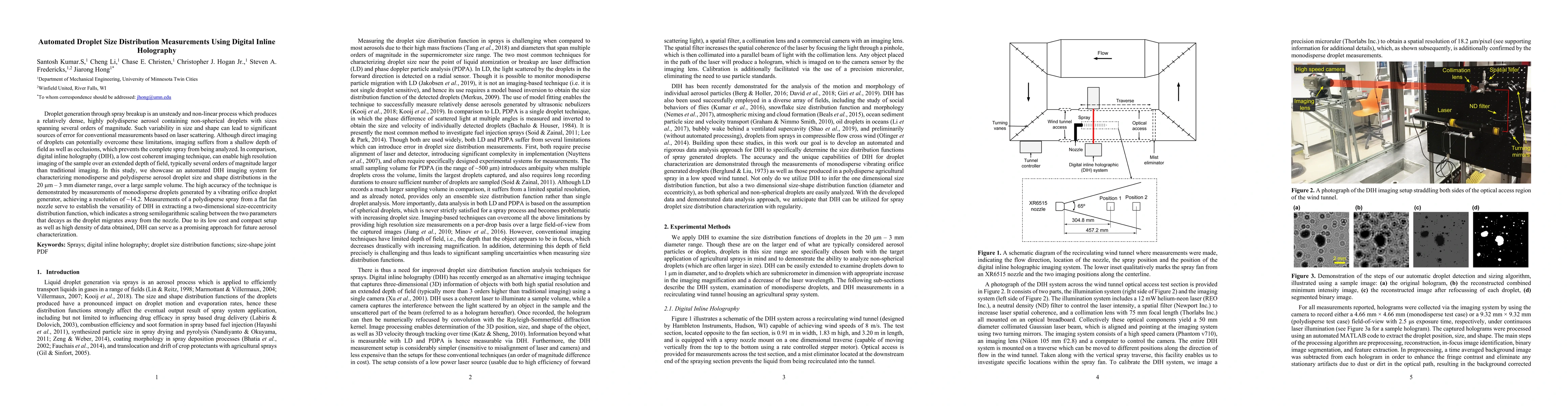 This paper presents an automated digital inline holography (DIH) system for measuring droplet size and shape distributions in aerosols, demonstrating high accuracy and resolution over a large sample volume. DIH's extended depth of field and low cost make it a promising alternative to conventional laser scattering methods, as shown by its successful application to both monodisperse and polydisperse droplet samples.