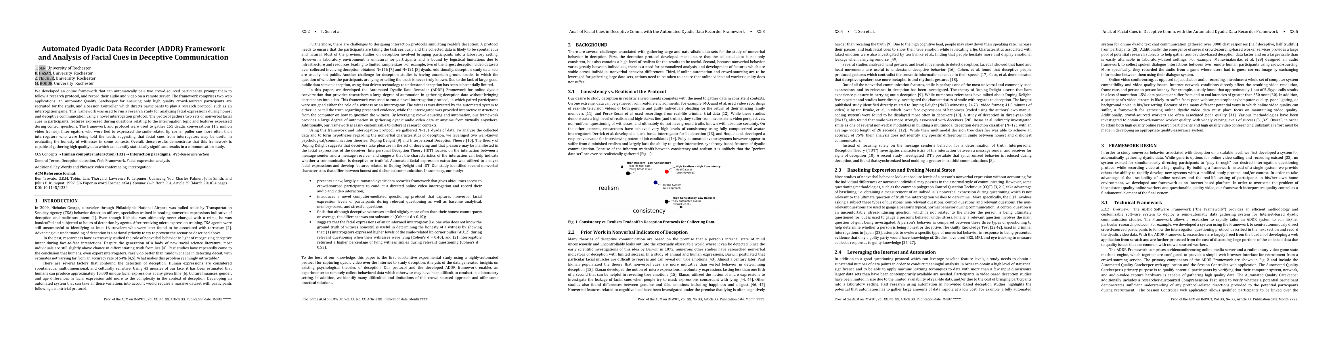 A new framework was developed to analyze facial cues in deceptive communication, gathering 151 dyadic conversations with high-quality data that found interrogators lied more often when shown the smile-related lip corner puller cue.