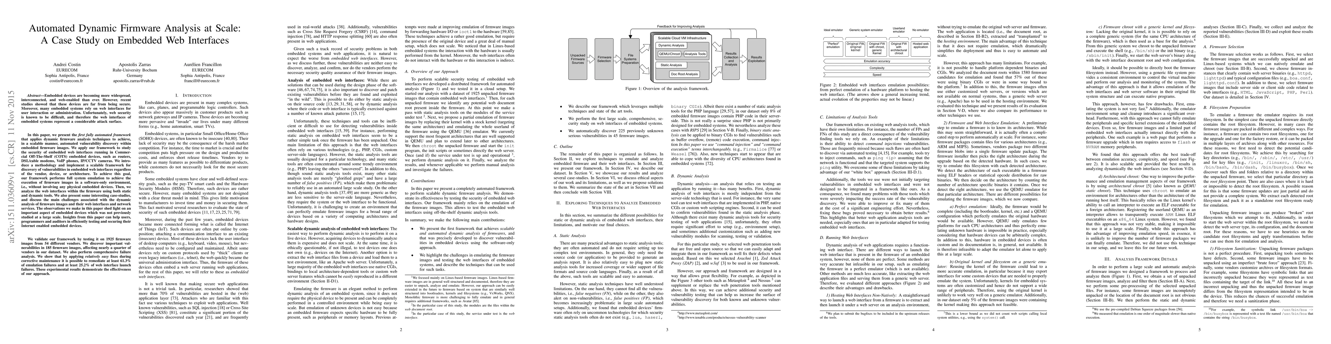 This paper introduces an automated framework for scalable dynamic firmware analysis to discover vulnerabilities in embedded web interfaces of COTS devices. The framework employs full system emulation and combines static and dynamic analysis techniques, revealing significant security flaws in nearly a quarter of tested firmware images from 54 vendors.