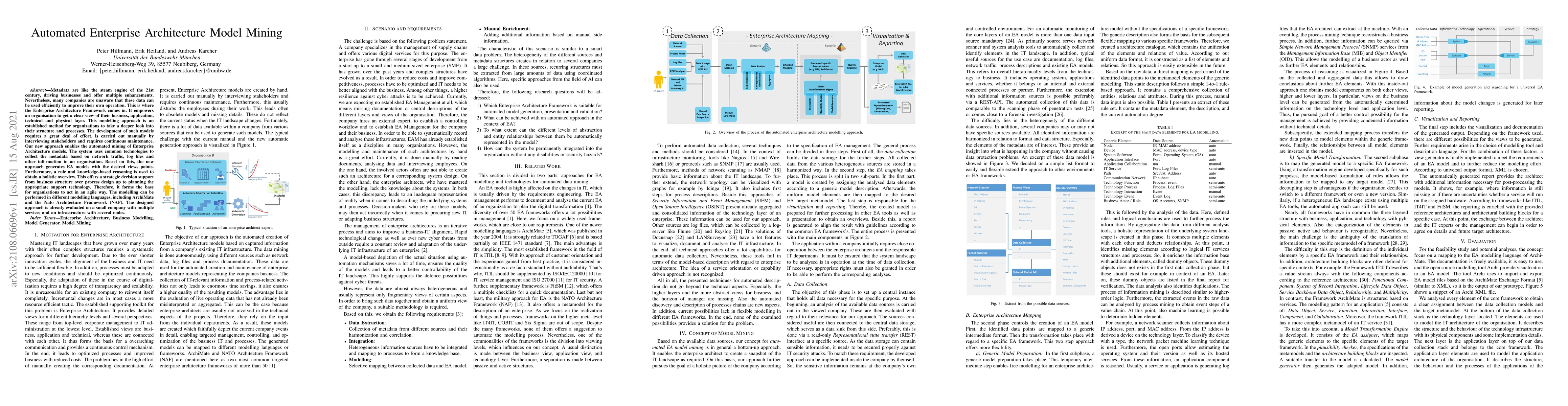 Metadata are like the steam engine of the 21st century, driving businesses and offer multiple enhancements. Nevertheless, many companies are unaware that these data can be used efficiently to improve their own operation. This is where the Enterprise Architecture Framework comes in. It empowers an organisation to get a clear view of their business, application, technical and physical layer. This modelling approach is an established method for organizations to take a deeper look into their structure and processes. The development of such models requires a great deal of effort, is carried out manually by interviewing stakeholders and requires continuous maintenance. Our new approach enables the automated mining of Enterprise Architecture models. The system uses common technologies to collect the metadata based on network traffic, log files and other information in an organisation. Based on this, the new approach generates EA models with the desired views points. Furthermore, a rule and knowledge-based reasoning is used to obtain a holistic overview. This offers a strategic decision support from business structure over process design up to planning the appropriate support technology. Therefore, it forms the base for organisations to act in an agile way. The modelling can be performed in different modelling languages, including ArchiMate and the Nato Architecture Framework (NAF). The designed approach is already evaluated on a small company with multiple services and an infrastructure with several nodes.