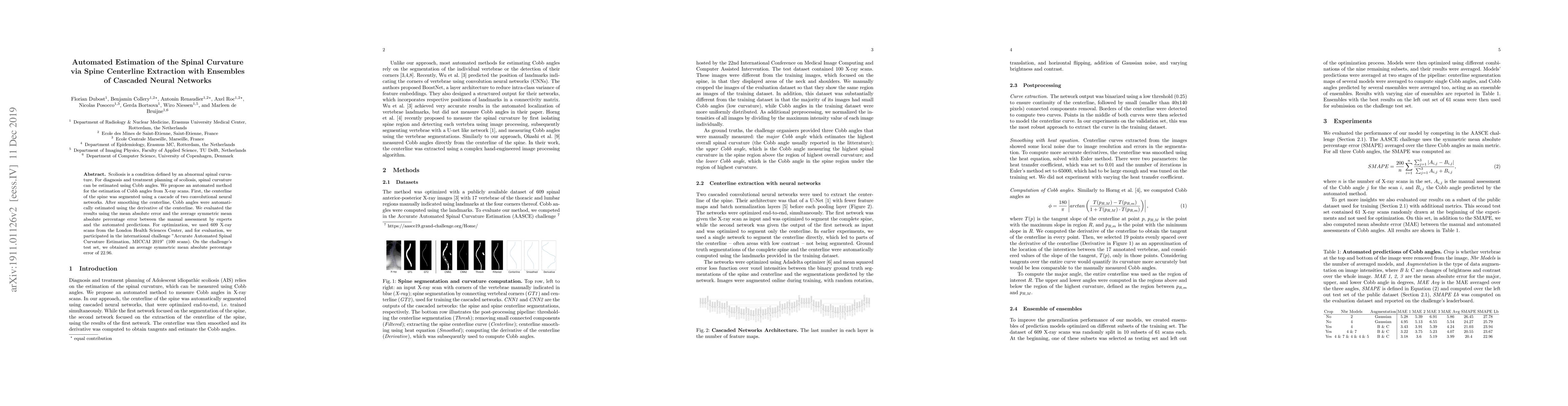 This paper proposes an automated method for estimating Cobb angles in scoliosis diagnosis using X-ray scans, employing a cascade of neural networks to extract the spine centerline and calculate curvature. The method achieved an average symmetric mean absolute percentage error of 22.96% in an international challenge.