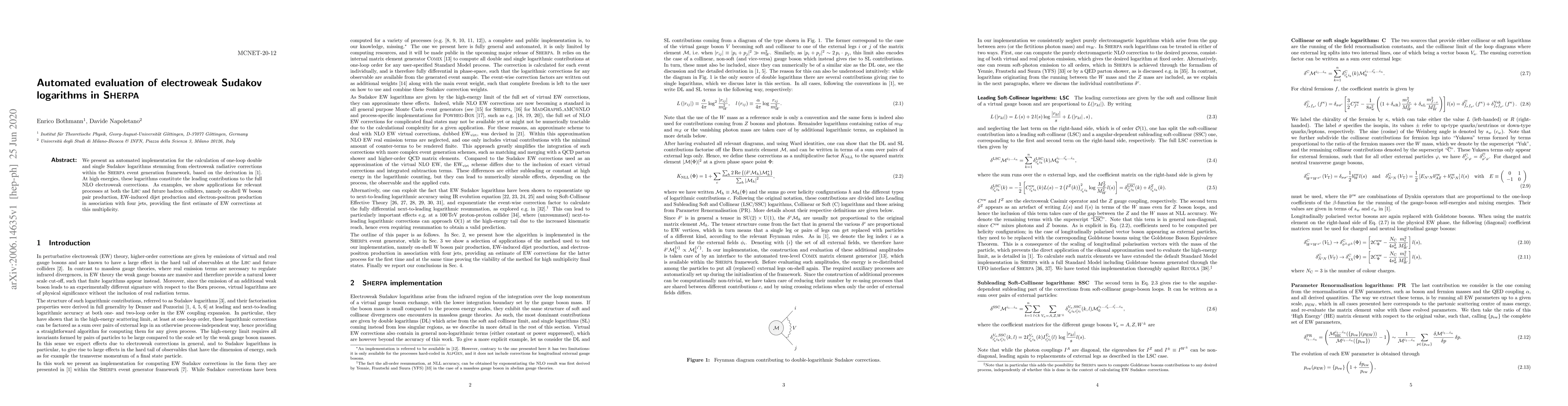 This paper introduces an automated method in Sherpa for calculating one-loop electroweak Sudakov logarithms, which are crucial for high-energy NLO electroweak corrections. The implementation is demonstrated through applications to W boson pair production, EW-induced dijet production, and electron-positron production with four jets at the LHC and future colliders.