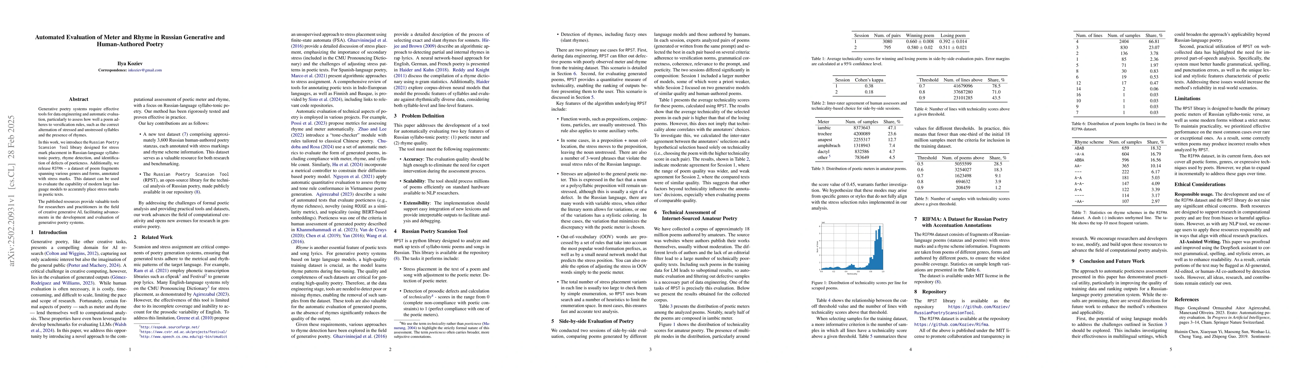 This research is significant for advancing computational poetry analysis, improving the quality of training data for Russian poetry generation, and providing tools for automatic evaluation of technical aspects of poetry, which can benefit both researchers and practitioners in creative generative AI.