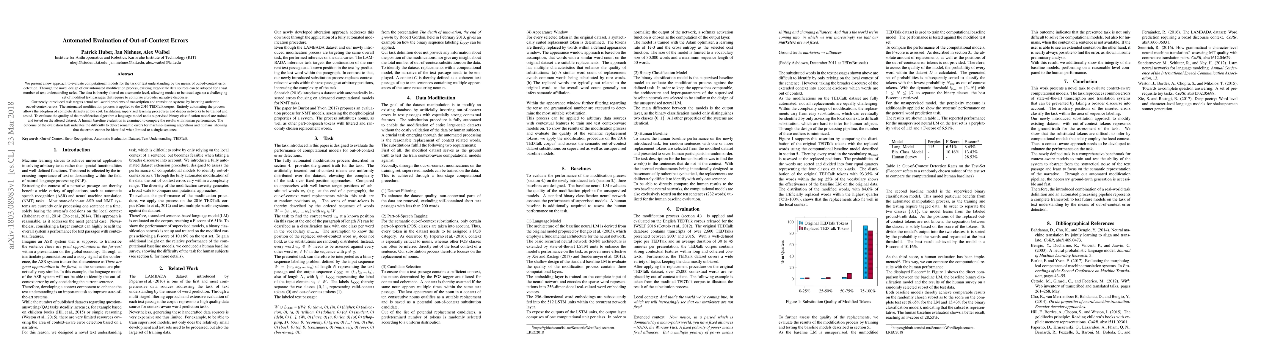 We present a new approach to evaluate computational models for the task of text understanding by the means of out-of-context error detection. Through the novel design of our automated modification process, existing large-scale data sources can be adopted for a vast number of text understanding tasks. The data is thereby altered on a semantic level, allowing models to be tested against a challenging set of modified text passages that require to comprise a broader narrative discourse. Our newly introduced task targets actual real-world problems of transcription and translation systems by inserting authentic out-of-context errors. The automated modification process is applied to the 2016 TEDTalk corpus. Entirely automating the process allows the adoption of complete datasets at low cost, facilitating supervised learning procedures and deeper networks to be trained and tested. To evaluate the quality of the modification algorithm a language model and a supervised binary classification model are trained and tested on the altered dataset. A human baseline evaluation is examined to compare the results with human performance. The outcome of the evaluation task indicates the difficulty to detect semantic errors for machine-learning algorithms and humans, showing that the errors cannot be identified when limited to a single sentence.