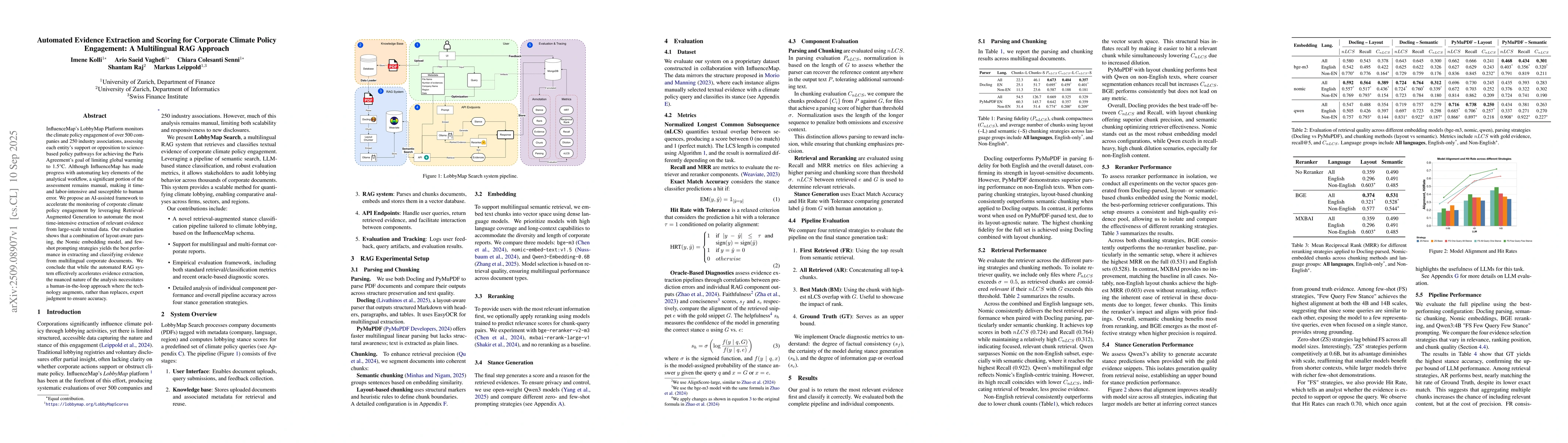 InfluenceMap's LobbyMap Platform monitors the climate policy engagement of over 500 companies and 250 industry associations, assessing each entity's support or opposition to science-based policy pathways for achieving the Paris Agreement's goal of limiting global warming to 1.5{\deg}C. Although InfluenceMap has made progress with automating key elements of the analytical workflow, a significant portion of the assessment remains manual, making it time- and labor-intensive and susceptible to human error. We propose an AI-assisted framework to accelerate the monitoring of corporate climate policy engagement by leveraging Retrieval-Augmented Generation to automate the most time-intensive extraction of relevant evidence from large-scale textual data. Our evaluation shows that a combination of layout-aware parsing, the Nomic embedding model, and few-shot prompting strategies yields the best performance in extracting and classifying evidence from multilingual corporate documents. We conclude that while the automated RAG system effectively accelerates evidence extraction, the nuanced nature of the analysis necessitates a human-in-the-loop approach where the technology augments, rather than replaces, expert judgment to ensure accuracy.