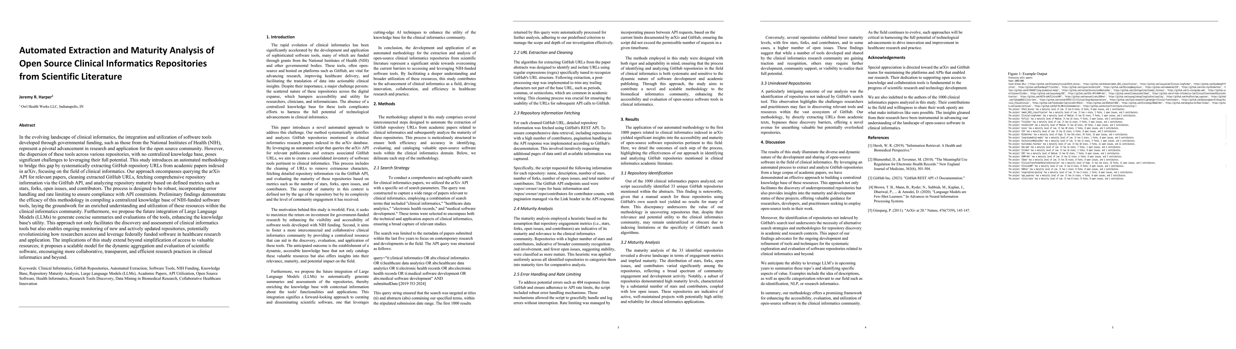 In the evolving landscape of clinical informatics, the integration and utilization of software tools developed through governmental funding represent a pivotal advancement in research and application. However, the dispersion of these tools across various repositories, with no centralized knowledge base, poses significant challenges to leveraging their full potential. This study introduces an automated methodology to bridge this gap by systematically extracting GitHub repository URLs from academic papers indexed in arXiv, focusing on the field of clinical informatics. Our approach encompasses querying the arXiv API for relevant papers, cleaning extracted GitHub URLs, fetching comprehensive repository information via the GitHub API, and analyzing repository maturity based on defined metrics such as stars, forks, open issues, and contributors. The process is designed to be robust, incorporating error handling and rate limiting to ensure compliance with API constraints. Preliminary findings demonstrate the efficacy of this methodology in compiling a centralized knowledge base of NIH-funded software tools, laying the groundwork for an enriched understanding and utilization of these resources within the clinical informatics community. We propose the future integration of Large Language Models (LLMs) to generate concise summaries and evaluations of the tools. This approach facilitates the discovery and assessment of clinical informatics tools and also enables ongoing monitoring of new and actively updated repositories, revolutionizing how researchers access and leverage federally funded software. The implications of this study extend beyond simplification of access to valuable resources; it proposes a scalable model for the dynamic aggregation and evaluation of scientific software, encouraging more collaborative, transparent, and efficient research practices in clinical informatics and beyond.