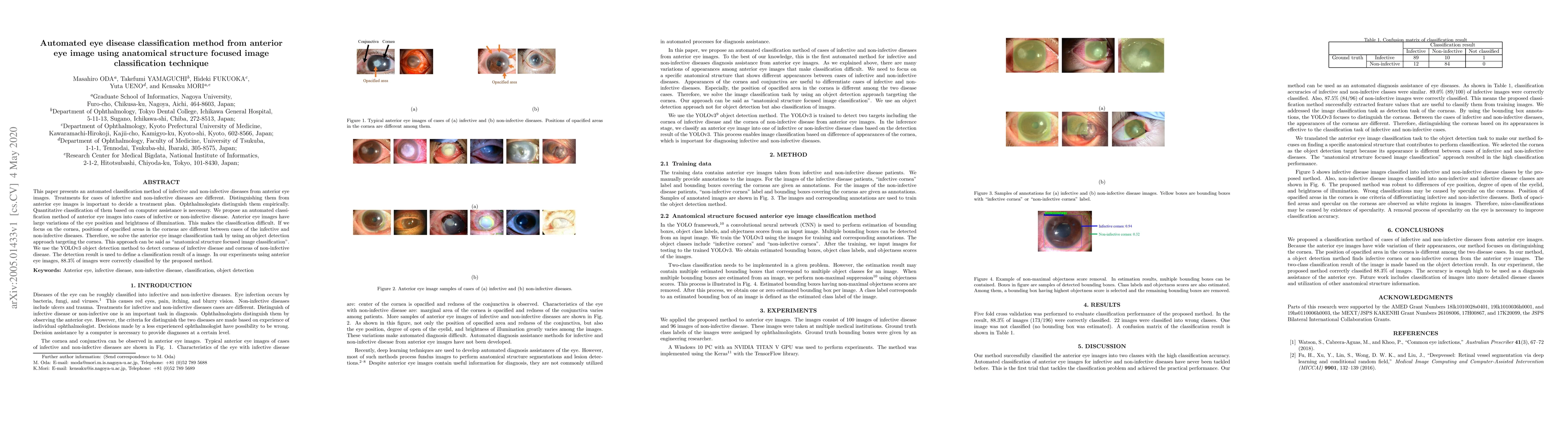 This paper proposes an automated classification method for infective and non-infective eye diseases using anterior eye images, employing an anatomical structure focused technique that targets the cornea with YOLOv3 object detection. The method achieved 88.3% accuracy in classifying the images.