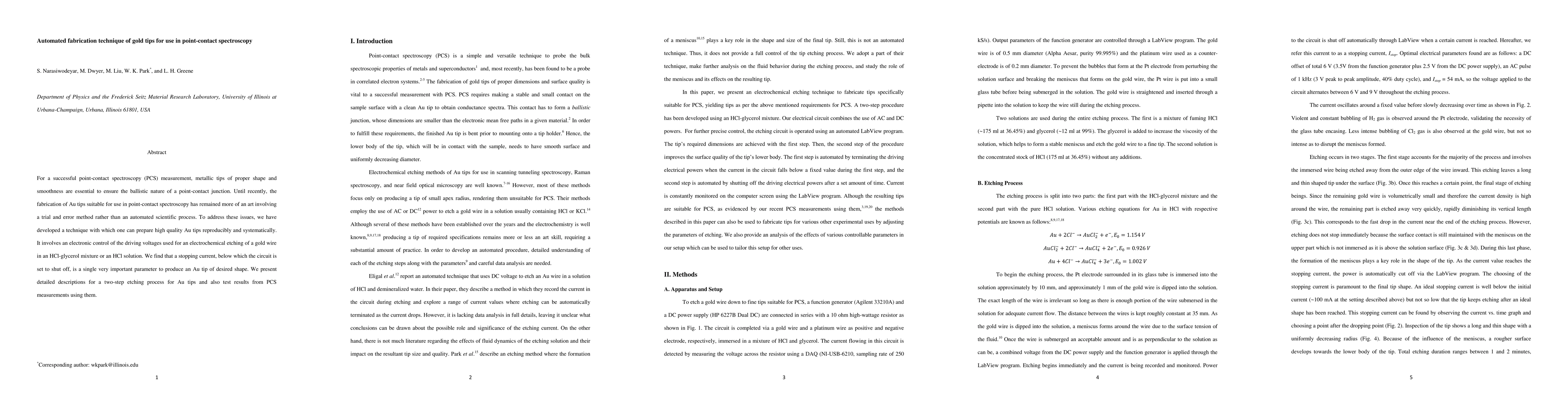 The paper introduces an automated fabrication technique for creating high-quality gold tips for point-contact spectroscopy, employing controlled electrochemical etching. The stopping current is identified as crucial for achieving desired tip shapes, ensuring reproducibility and enhancing measurement accuracy.